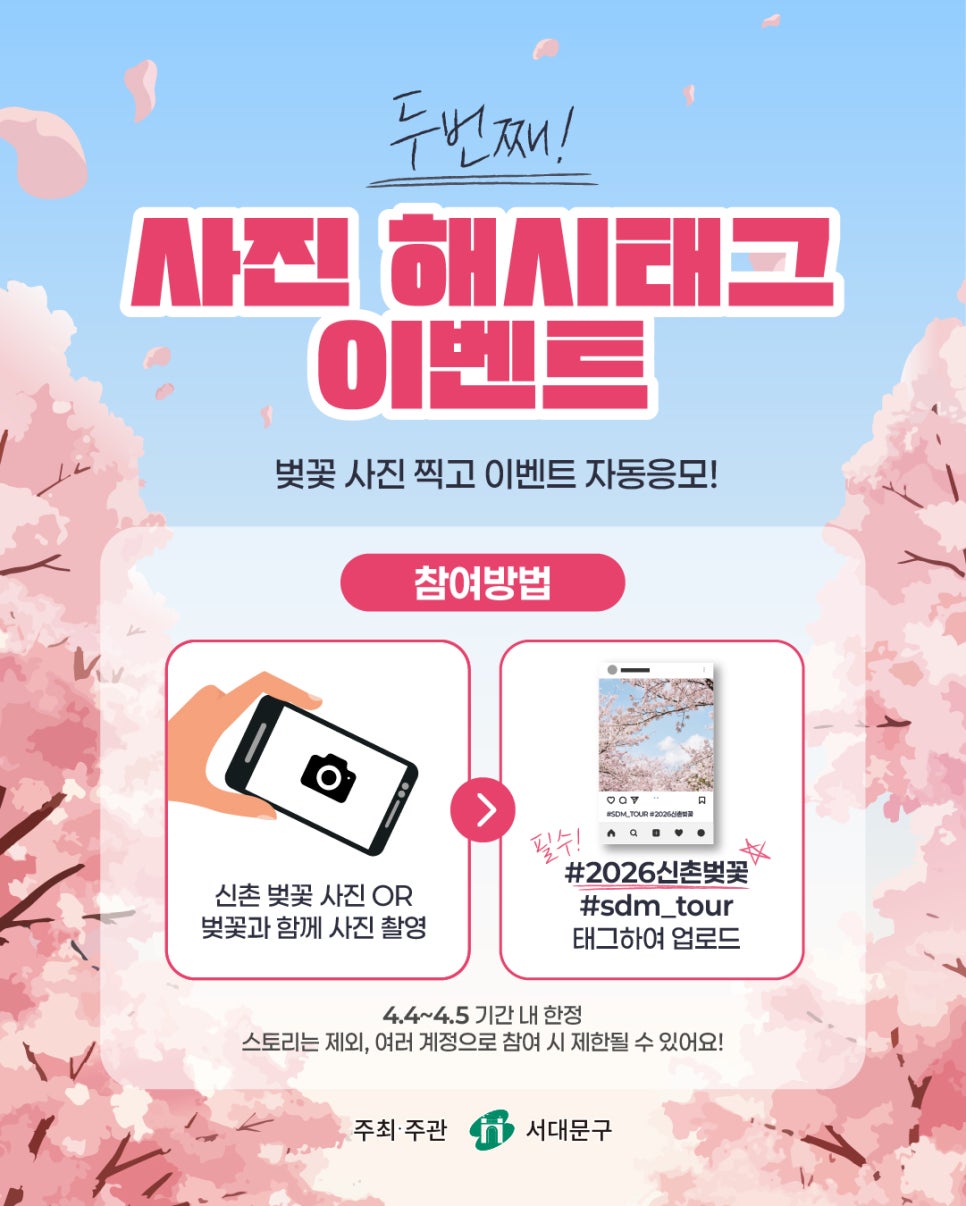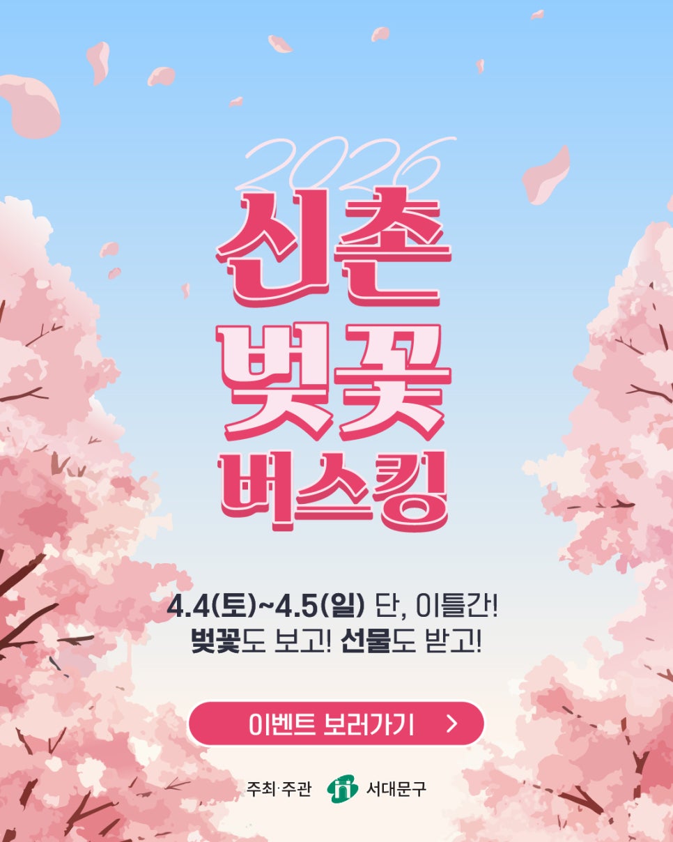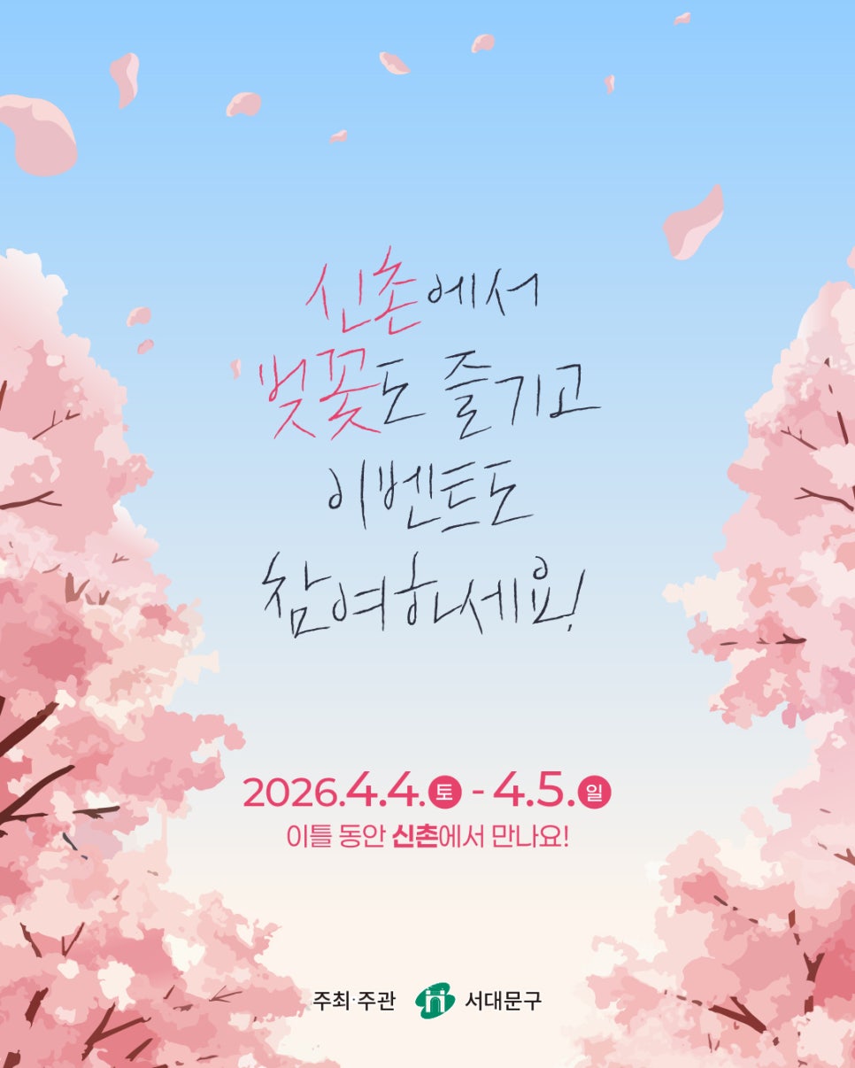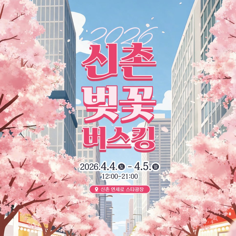 🌸 2026 신촌 벚꽃 버스킹 2026 신촌 벚꽃 버스킹 벚꽃도 보고! 선물도 받는 이벤트 🌸 2026 신촌 벚꽃 버스킹 벚꽃이 아름답게 피는 봄, 신촌에서 벚꽃도 즐기고 선물도 받을 수 있는 특별한 이벤트가 진행됩니다. 단 이틀 동안 진행되는 신촌 벚꽃 버스킹 이벤트! 벚꽃을 즐기며 신촌에서 먹고, 마시고, 이벤트에도 참여해 푸짐한 선물까지 받아보세요 🌸 📅 이벤트...