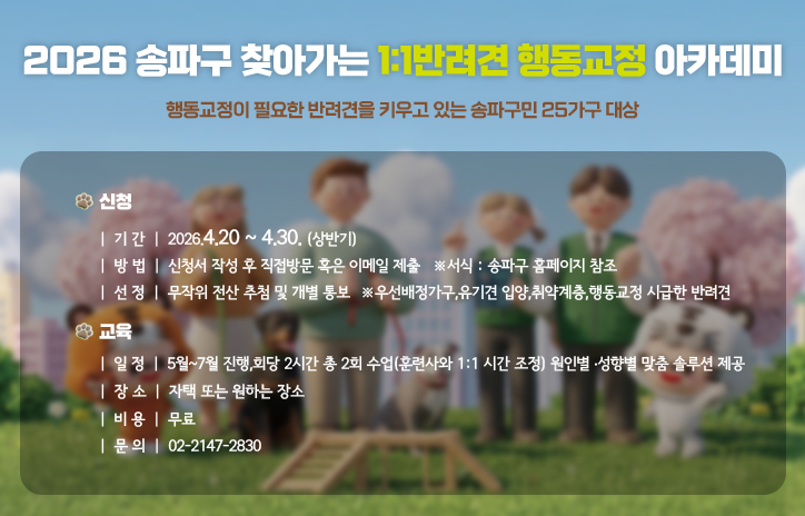○ 사업개요 - 사업내용 : 전문 훈련사의 반려견 문제행동 분석 및 1:1 행동교정 , 솔루션 제공 · 교육 - 신청기간 : 4. 20.( 월 ) 09:00 ~ 4. 30.( 금 ) 18:00 - 모집대상 : 행동교정이 필요한 반려견을 키우는 송파구민 총 25 가구 ※ 동물등록 필수 ※ 신청자와 소유자 일치 , 주민등록상 주소지가 송파구여야 함 - 선정기준 : 무작위 전산 추첨 ( 개별통보 예정 ) ※ 우선배정가구 : 유기견입양 , 취약계층 , 행동교정 시급한 반려견 ○ 교육개요 - 기 간 : 5~7 월 진행 - 시 간 : 회당 2 시간 총 2 회 수업 ( 훈련사와 1:1 시간 조정 ) - 장 소 : 신청자 자택 또는 원하는 장소 ○ 신청방법 : 직접 방문 ( 송파구청 문화예술과 ) 또는 이메일 접수 - 제출서류 : 행동교정 아카데미 신청서 (📌서류 다운로드: https://www.songpa.go.kr/www/selectBbsNttView.do?bbsNo=92&nttNo=19275884&&pageUnit=10&key=2775&pageIndex= 1 ) ※ 우선 배정가구의 경우 추가서류 첨부 필요( 추가서류는 신청서 참고 ) - 이메일 주소 : suji135@songpa.go.kr - 문의 : 02-2147-2830 ○ 유의사항 - 신청 기간 이외의 접수 건은 인정되지 않습니다 . - 전문업체의 사전테스트 및 면담을 통해 문제행동이 발견되지 않은 반려가구는 신청이 취소될 수 있습니다 . ※ 아래 URL 을 통해 자세한 훈련내용 을 확인해 보세요 . https://www.breeeeeding.com/banner/2026/songpa/main