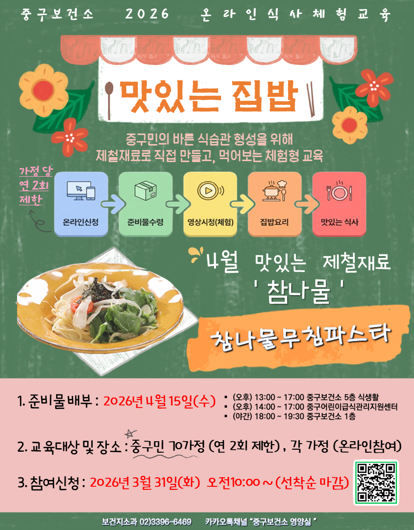 중구보건소와 함께하는 🥗🍴 2026년 4월 온라인식사체험교육 🤍 참여 대상자 모집 안내 ◾교육방법 준비물 수령 후 각 가정에서 교육영상을 보며 직접 만든 후 식사를 하는 교육입니다! ※ 교육영상은 대상자 분들께 교육당일 문자로 발송 ※ 준비물 일부 별도 제공 < 메 뉴 > 참나물무침 파스타 ◾준비물 배부 2026. 4. 15.(수) ✅ (오후) 13:00~17:00 중구보건소 ...
