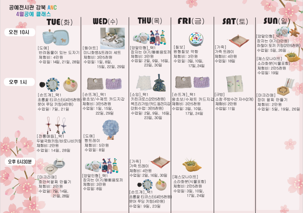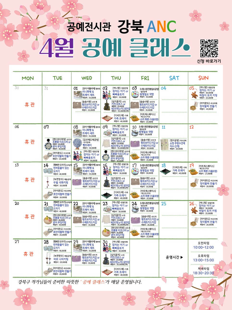 4월에도 강북 ANC(Art aNd Crafts)의 공예 체험 클래스는 계속됩니다. 3월부터 저녁 수업 진행하는 거 잊지 않으셨지요? 여러분의 숨겨왔던(^^) 공예 감성을 깨우고, 자신을 위한 힐링의 시간 + 누군가를 위한 예쁜 선물도 마련하시기 바랍니다. ○ 공예 분야: 가죽, 규방(자수), 도예, 마크라메, 섬유(소잉), 손뜨개, 양말인형, 웜아트, 전통매듭, 제스모...