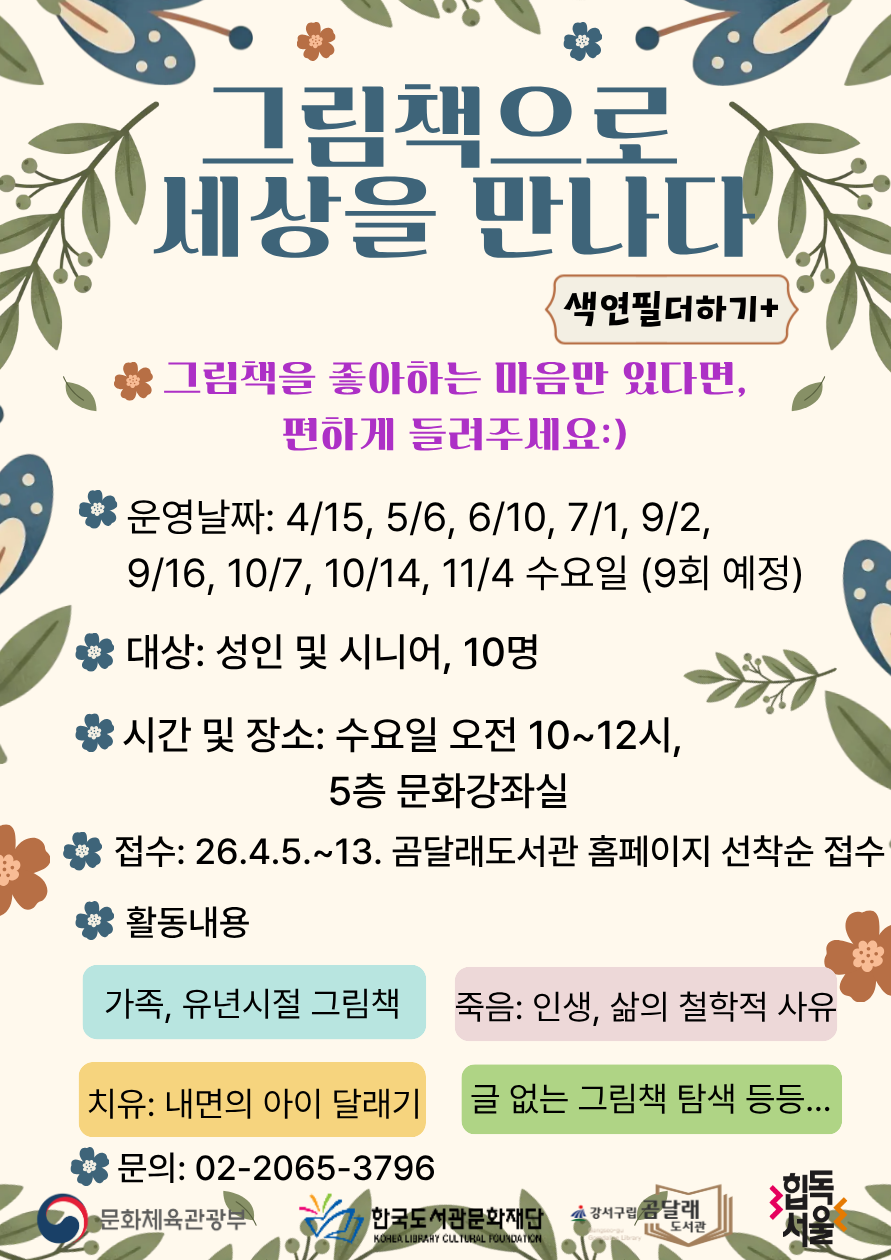 곰달래도서관에서 그림책으로 세상을 배우는 문화예술동아리 활동을 지원해준대, 혼자여도 괜찮아!