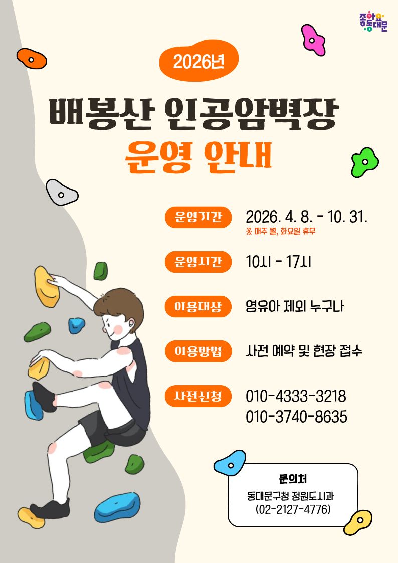 요즘 핫한 클라이밍, 집 근처에서 가볍게 시작해봐요 ! ◆모집개요 -이용대상 : 영유아를 제외한 누구나 -운영기간 : 04. 08.(수) ~ 10. 31.(토) 10:00 ~ 17:00 *매주 월, 화요일 휴무 -이용방법 : 사전 예약(010-4333-3218, 010-3740-8635) 또는 현장 접수 -문의 : 동대문구청 정원도시과 02-2127-4776