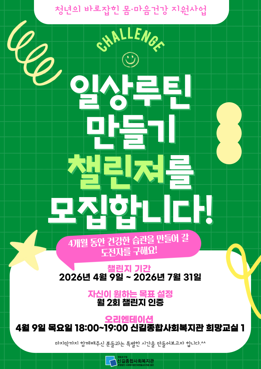 [일상루틴 만 들기 챌린지] 무언가 시작하고 싶지만 막막하게 느껴지시나요? 같이 정하고 같이 달성해봐요! 5분 산책하기 10분 스트레칭하기 10분 명상하기 나의 공간 정리하기 하루에 하나, 아주 작은 행동이라도 충분합니다. ○ 기간: 2026.04.09.(목)~2026.07.31.(금) ○ 모집: 15명(선착순) ※ 신청자가 15명 이상일 경우 참여율을 고려하여 선정할 예정입니다. ○ 오리엔테이션: 2026.04.09.(목) 18:00~19:00 ※ 참여자 선정 후 일정이 변경될 수 있습니다. ○ 세부내용 - 오리엔테이션: 참여자와 인사를 나누고 함께 달성할 챌린지 목표 설정합니다. - 챌린지(온라인/오프라인): 함께 정한 목표 수행하고 챌린지를 하며 장점과 단점, 달성팁을 공유합니다. - 워크숍: 챌린지를 수행하기 위한 노력을 격려하고 축하하는 자리를 가져봅니다. 문의 기관) 02-831-2755 (최나은 사회복지사) 직통) 070-4088-0813