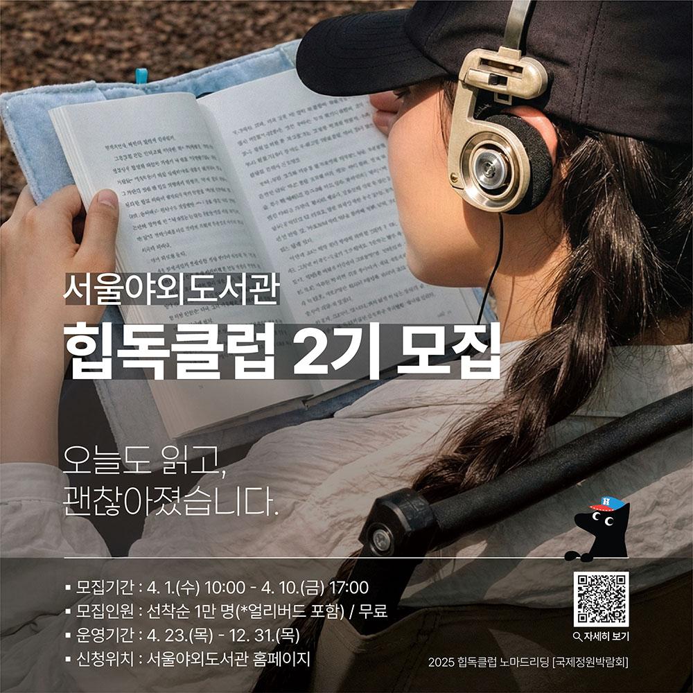<2026년 서울야외도서관 힙독클럽 2기 모집> 작년, 모집 시작 2시간 만에 마감된 그 독서클럽. 서울야외도서관 힙독클럽 2기 모집이 돌아왔습니다! 독서도 취향이 되는 시대, 힙독클럽에서 나만의 독서 취향 만들어볼까요? 온라인과 오프라인 어디서든 취향에 맞는 책으로 다른 사람들과 느슨하게 연결되고, 따로 또 같이 읽는 경험을 해보세요 활동 등급에 따라 지역서점에서 사용할 수 있는‘서울서점페이’도 드려요 올해는 ‘베르나르 베르베르’, ‘알랭 드 보통’ 등 세계적인 작가와 만날 기회까지! 이번엔 놓치지 마세요 📌신청기간: 2026. 4. 1.(수) 10:00 ※ 선착순 모집 📌모집대상: 독서에 관심있는 만 14세 이상 누구나 📌모집인원: 1만 명 (얼리버드 1천명 포함) 📌활동기간: 2026. 4. 23.(목)~12. 31.(목) 📌신청방법: 서울야외도서관 누리집 가입 후 > 힙독클럽 > 소개 및 가입에서 신청 바로가기: https://seouloutdoorlibrary.kr/user/hipdok/recruit/hipdokRecruitIntro.do 📌문의: 서울야외도서관 힙독클럽 운영사무국 (070-5143-5663)