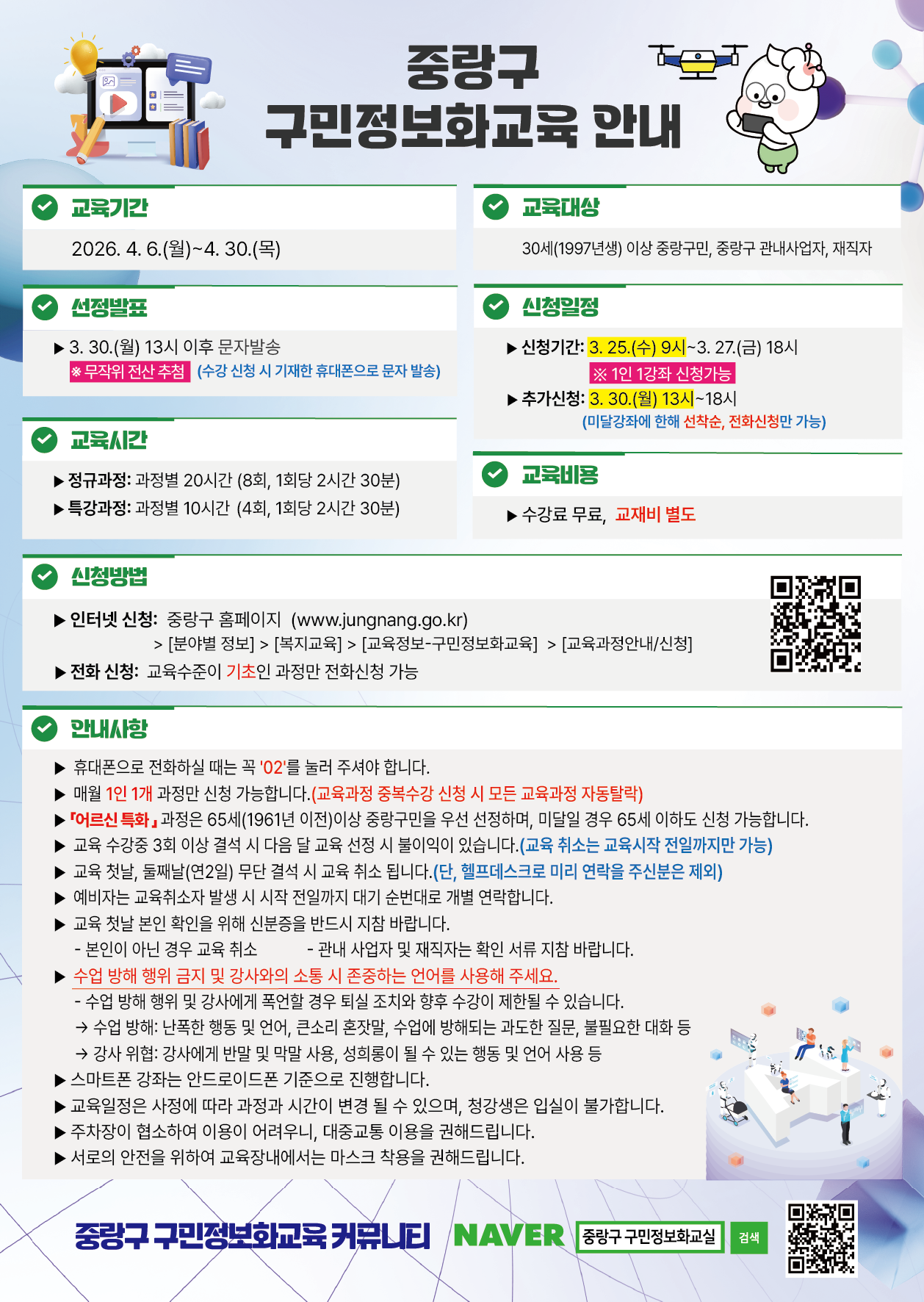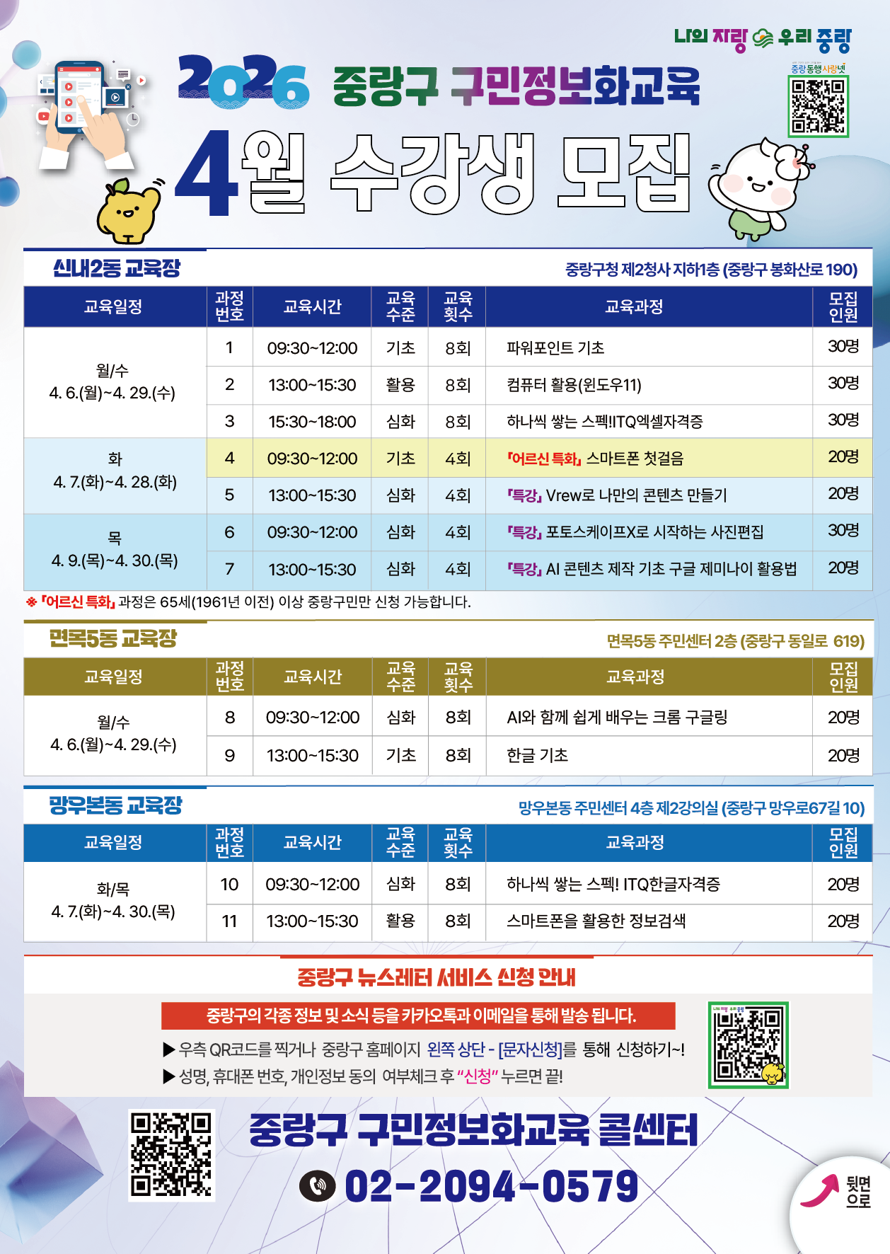 중랑구청<4월구민정보화교육 수강생 모집> 신청대상 : 30 세 (1997 년생 ) 이상 중랑구민 및 중랑구 관내사업자 , 재직자 신청기간 : 3 . 25.( 수 ) 9 시 ~ 3. 27.( 금 ) 18 시 ※ 전과정 인터넷 신청 , 기초과정에 한해 전화신청 가능 ※ 정원 미달 시 추가접수 예정 신청방법 : 중랑구청 홈페이지 (jungnang.go.kr) 및 기초반은 콜센터 전화접수 선정자발표 : 3 . 30.( 월 ) 13:00 수강 신청 시 기재한 휴대폰 으로 문자 발송 강의일정 : 월 / 수 4. 6.~4. 29. 화 / 목 4. 7.~4. 30. 화 특강 4. 7.~4. 28. 목 특강 4. 9.~4. 30. 일반과정 8 회 , 특강 4 회 진행 문의: 중랑구 구민정보화교육 콜센터(02-2094-0579)