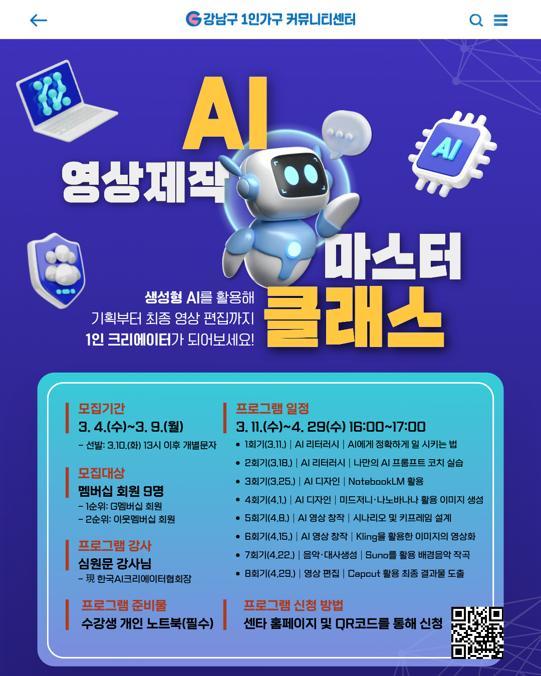 AI 영상제작 마스터 클래스 생성형 AI를 활용해 기획부터 최종 영상 편집까지 1인 크리에이터가 되어보세요! │모집기간 3. 4.(수)~3. 9.(월) - 선발: 3. 10.(화) 13시 이후 개별문자 │모집대상 멤버십 회원 9명 - 1순위: G멤버십 회원 - 2순위: 이웃멤버십 회원 │프로그램 강사 심원문 강사님 - 現 한국AI크리에이터협회장 │프로그램 준비물 수강생 개인 노트북(필수) │프로그램 일정 3. 11.(수)~4.29.(수) 16:00~17:00 │신청 링크 https://www.gangnam1.org/main/sub.html?Mode=view&pageCode=10&eduNum=136