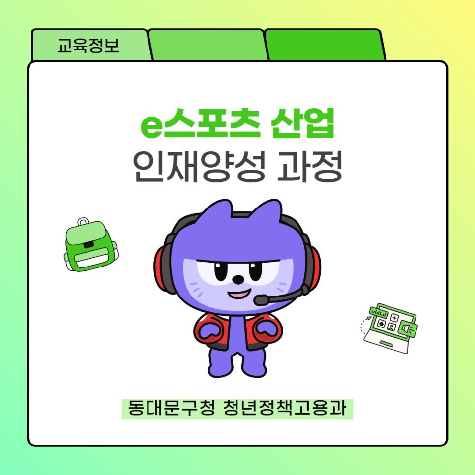 동대문구 <e스포츠 산업 인재양성 교육> e스포츠, 제대로 배워보고 싶다면❓ 동대문구 <e스포츠 산업 인재양성 교육>으로 산업 이해부터 마케팅, 실무 프로젝트까지 한 번에 경험해보세요🎮 🎧 신청대상 동대문구 거주 만 19 ~ 39세 청년 (30명) 🎧 교육기간 4. 11.(토) ~ 6. 27.(토) 매주 토요일 14:00 ~ 15:30 (예정) 🎧 교육장소 동대문구...