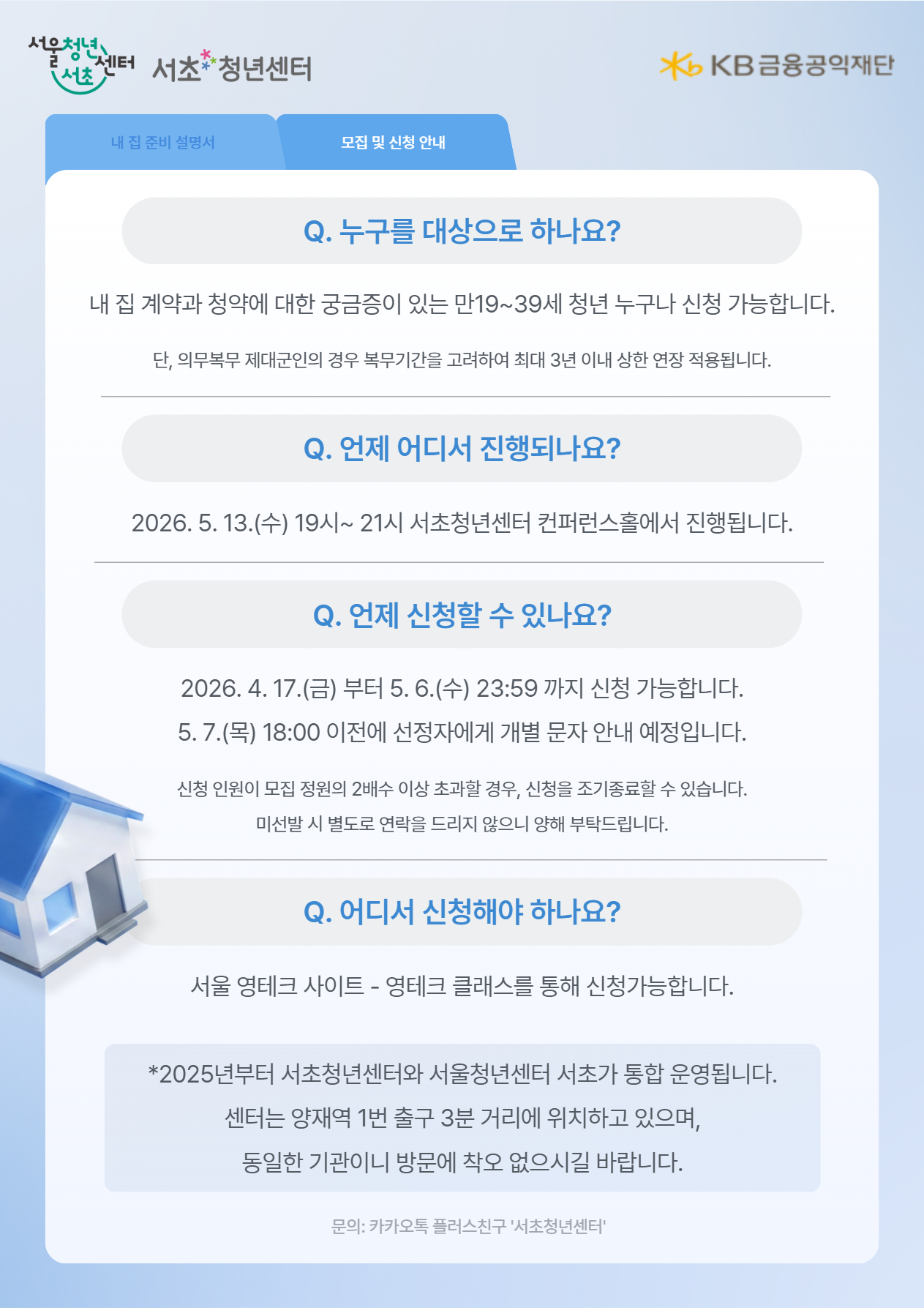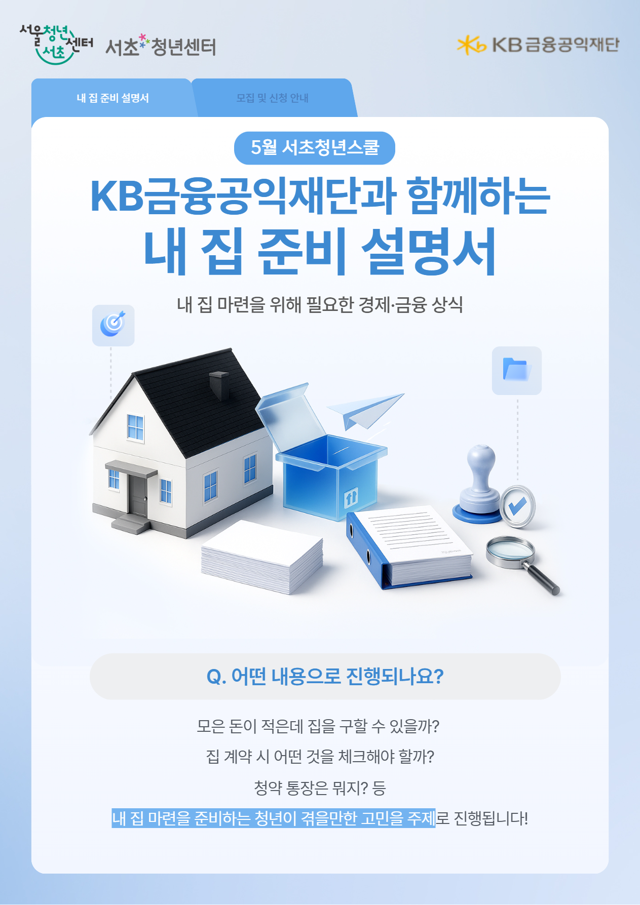 💡 5월 서초청년스쿨 – 내 집 준비 설명서 내 집 마련, 어디서부터 시작해야 할지 막막하다면? 🤔 청약부터 계약까지 꼭 필요한 핵심만 알려드립니다 🏡 📅 2026.05.13.(수) 19:00~21:00 📍 서초청년센터 컨퍼런스홀 👥 만 19~39세 청년 🗓️ ~ 05.06.(수) 23:59까지 신청 ※ 선정자 개별 안내 📌 서울 영테크 ‘영테크 클래스’ 신청 📞 카카오톡 ‘서초청년센터’