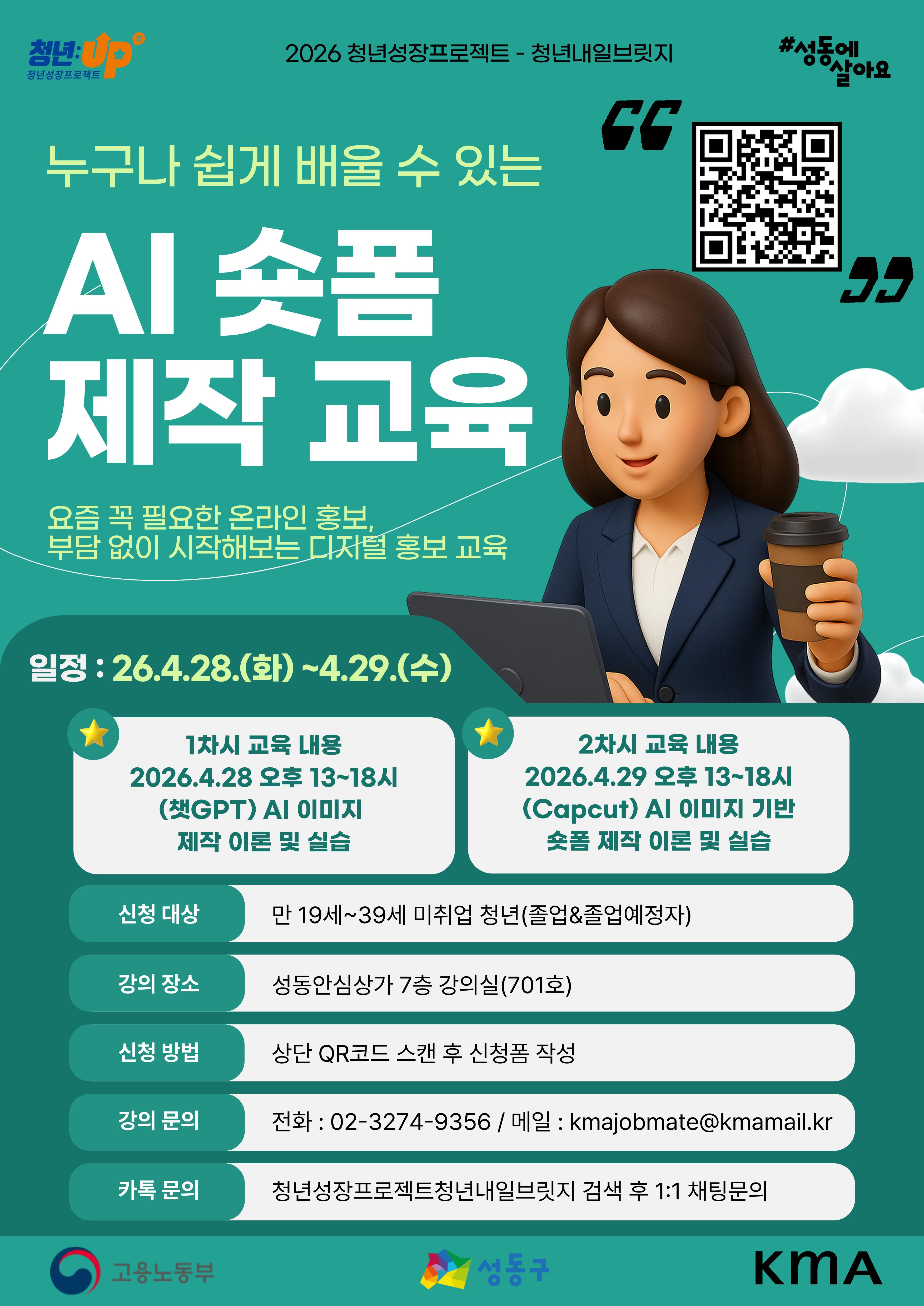 4월 프로그램 안내 - AI 활용 SNS 숏폼 제작 클래스 안녕하세요, 성동구 청년카페 - 청년내일브릿지입니다! AI를 활용해 콘텐츠를 만들어보고 싶은데 막막하게 느껴지신 적 있으신가요? 이미지 생성부터 숏폼 영상 제작까지 AI를 활용한 콘텐츠 제작 과정을 직접 경험할 수 있는 실습형 클래스를 준비했습니다! 콘텐츠 제작에 관심 있거나, 나만의 숏폼을 만들어보고 싶은 분들께 추천드립니다. 관심 있는 분들은 바로 신청해주세요! 📌 오늘의 프로그램 키워드 #청년내일브릿지 #AI활용 #숏폼제작 #콘텐츠제작 #이미지생성 #캡컷 📌 대상 AI 및 콘텐츠 제작에 관심 있는 만 19세~39세 미취업 청년 📌 인원 정원 내 선발 📌 일정 2026년 4월 28일(화) ~ 4월 29일(수) 오후 13~18시 (2일 과정) 📌 주요 내용 1차시: (ChatGPT) AI 이미지 제작 이론 및 실습 2차시: (CapCut) AI 이미지 기반 숏폼 제작 이론 및 실습 📌 장소 성동안심상가 7층 701호 📌 준비물 개인 노트북 지참 권장 📌 신청 방법 링크 신청 : https://docs.google.com/forms/d/e/1FAIpQLSci0dqkl9oDDqpA9z37JNaAjJVAoAzHJIU_6xhyyQ8TKvqAPw/viewform?usp=header 📌 참여 선정 안내 선정된 청년 대상 개별 연락 연락 후 일정 기간 내 회신이 없을 경우 참여가 취소될 수 있습니다. 취소자 발생 시 대기자에게 순차적으로 연락드립니다. 📌 문의 전화: 02-3274-9356 메일: kmajobmate@kmamail.kr 카카오채널 : http://pf.kakao.com/_HWpZX 카카오채널: 청년성장프로젝트 청년내일브릿지 📌 안내사항 선정 후 노쇼 시 이후 프로그램 참여가 제한될 수 있습니다. 본 프로그램은 2026 청년성장프로젝트의 일환으로 진행됩니다.