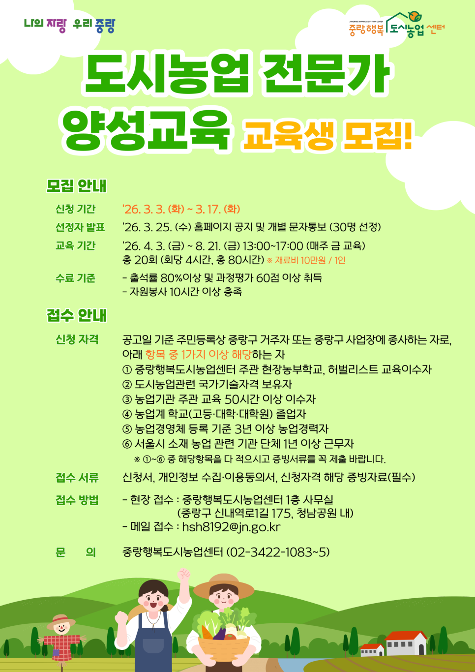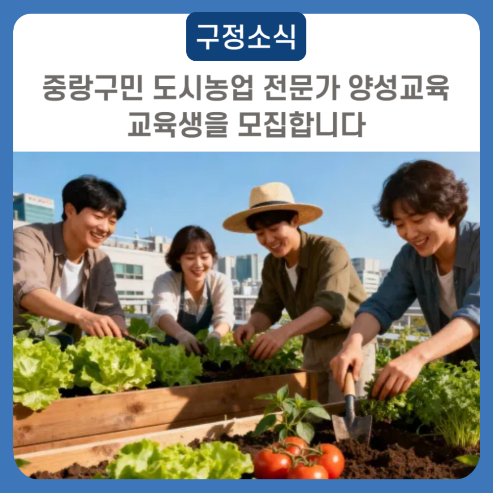 [구정소식] 중랑구민 도시농업 전문가 양성교육 교육생을 모집합니다 문의 : 중랑행복도시농업센터(☎ 02-3422-1083~5) 중랑행복도시농업센터가 2025년 도시농업 전문인력 양성기관으로 지정됨에 따라 올해부터 도시농업 전문가 양성교육을 실시합니다. 도시농업 전문가 양성교육은 도시농업의 기초 이론부터 실습, 현장적용까지 체계적으로 습득함으로써 녹색복지 실현과 도시농업 활성화를 목표로 하고 있습니다.