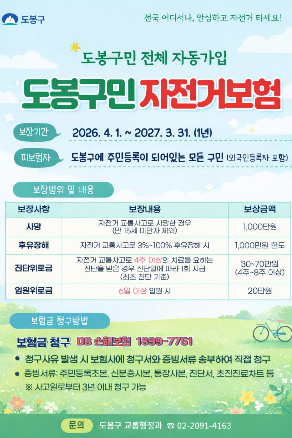 2026년 도봉구민 자전거보험 안내 “도봉구민 전체 자동가입” 전국 어디서나, 안심하고 자전거 타세요! ▢ 보험 계약사항 ○ 보장기간: 2026. 4. 1. ~ 2027. 3. 31.(1년) ○ 피보험자: 도봉구에 주민등록이 되어있는 모든 구민(외국인등록자 포함) ○ 가입절차: 도봉구민 전체 자동 가입(별도의 가입 절차 없음) ▢ 보장 범위 및 내용 ○ 자전거를 직접 운전 ...