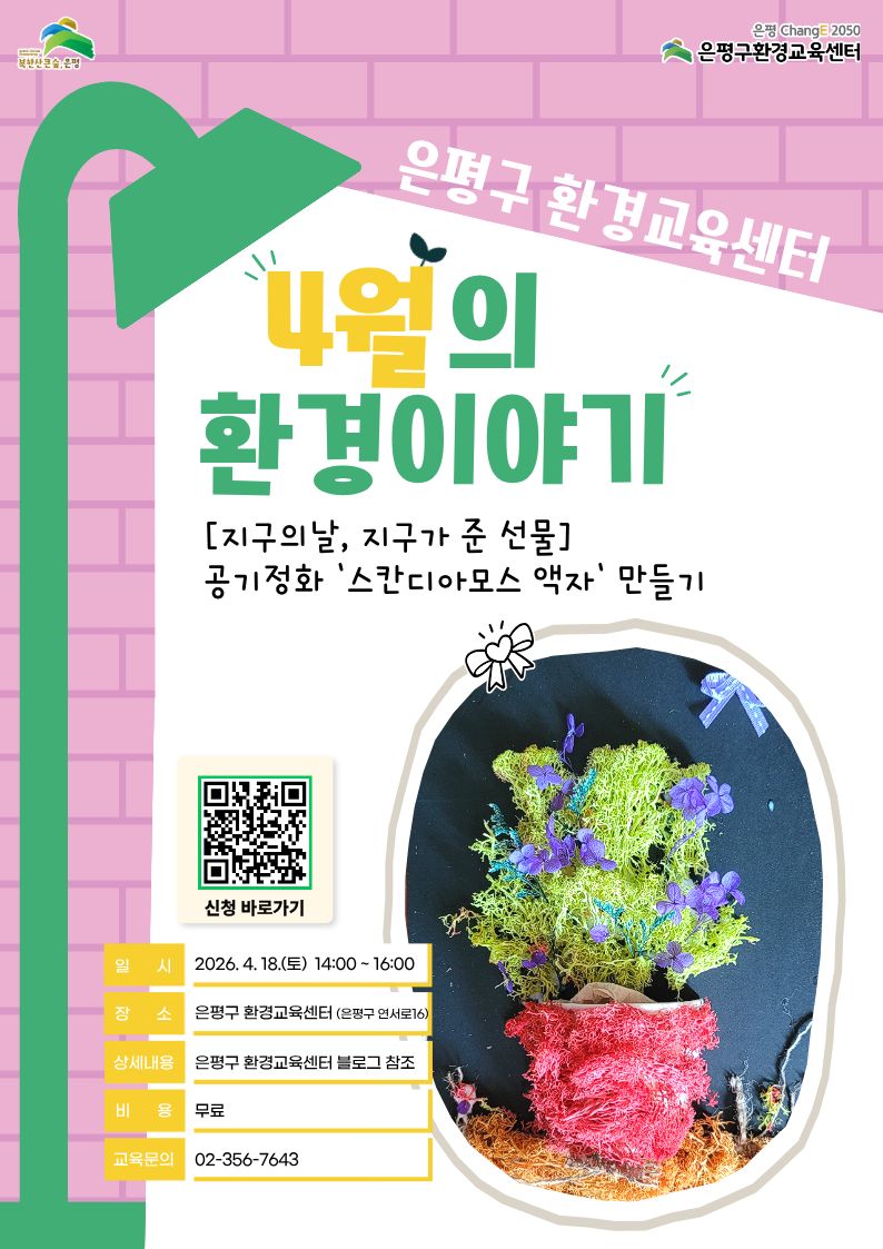 🐝🌿 은평구환경교육센터 <4월의 환경이야기> 참여자 모집 우리가 미처 몰랐던 꿀벌의 이야기부터, 점점 가까워지고 있는 기후위기의 현실까지— 이번 4월의 환경이야기에서는 기후 변화와 생태계의 연결고리를 함께 알아보고, 지구를 위한 작은 실천을 약속하는 시간 을 준비했습니다 🌍 또한, 공기정화와 가습 효과가 있는 스칸디아모스 액자 만들기 체험 도 함께 진행됩니다! 환경도 배우고, 나만의 작품도 만들어보는 특별한 시간을 함께해보세요 😊 🌿 프로 그램 안내 일시 : 4월 18일(토) 오후 2시 ~ 4시 장소 : 은평구환경교육센터 대상 : 은평구민 누구나 (가족, 연인, 친구와 함께 참여 가능) 📌 모집 안내 모집 기간 : 2026. 04. 10. ~ 선착순 마감 모집 인원 : 25명 참여 안내 - 은평구민 우선 선발 - 1회 신청 시 최대 3명까지 가능 ※ 동반 참여자의 이름을 모두 기입해야 신청이 완료됩니다 ※ 3명 초과 시 별도 추가 신청 필요 수강료 : 무료 📞 신청 및 문의 신청 방법 : 아래 링크를 통해 신청▼▼ https://form.naver.com/response/y50j2eu1XyWOobc8FrgRSw 문의 : 02-356-7643 꿀벌과 지구의 이야기를 함께 배우고, 작은 실천을 시작하는 의미 있는 시간 🌱 많은 관심과 참여 부탁드립니다!