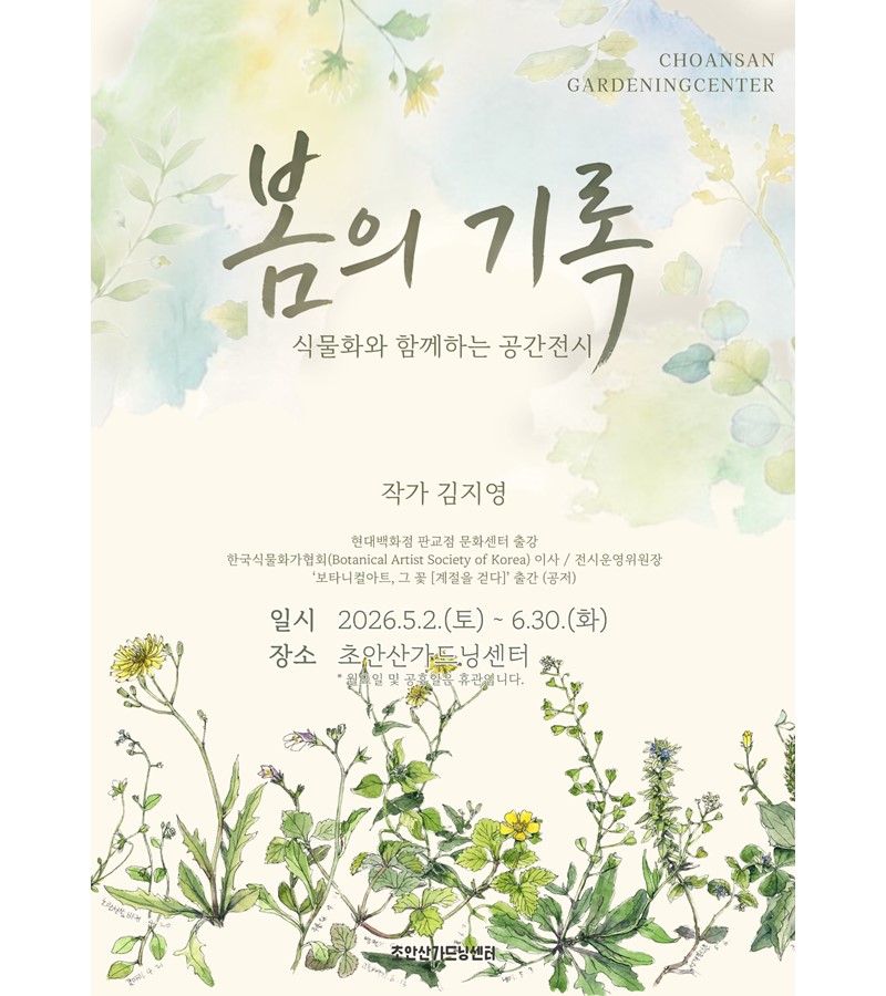 「초안산가드닝센터 ‘봄의 기록’ 식물화와 함께하는 공간전시」 개최 초안산가드닝센터에서 식물화와 함께하는 공간전시 ‘봄의 기록’을 통해 일상에서 정원문화콘텐츠를 경험해 볼 수 있는 시간을 제공하오니 구민 여러분의 많은 관심과 참여 바랍니다. ○ 장 소: 초안산가드닝센터(도봉구 노해로 66길 98-122) ○ 일 시: 2026. 5. 2.(토) ~ 6. 30....