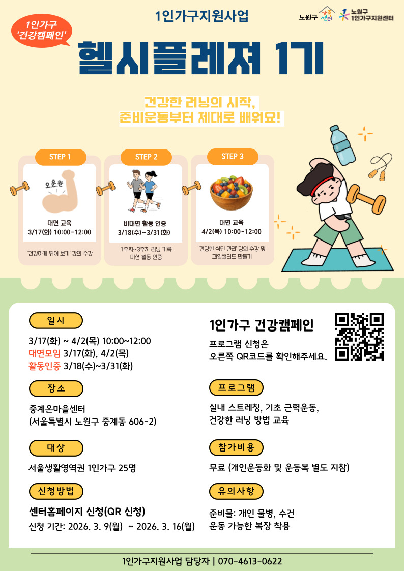노원구가족센터 <1인가구지원사업 - 헬시플레저 1기 모집> 안녕하세요! 노원구가족센터입니다. 따뜻한 봄 기운을 맞이하여 3월에는 1인가구의 건강한 삶과 지속적인 관리를 위해 올바른 러닝 방법 및 건강한 식단 구성 프로그램이 시작됩니다! 관심 있는 1인가구 분들은 많은 신청 바랍니다! - 일시 : 3/16(화) 10:00-12:00 / 4/2(목) 10:00-12:00 - 장소 : 중계온마을센터 강당 - 대상 : 서울생활영역권 1인가구 25명 - 내용 : 건강한 러닝 방법 및 식사 관리 교육 - 참가비 : 무료 ※ 요가매트가 센터에서 제공될 예정입니다. ※ 1회기 이후 프로그램 취소 및 결석 시 제공된 요가매트는 반드시 센터로 반납해 주셔야 하며, 미이행 시 패널티가 적용됩니다. - 문의 : 070-4613-0622