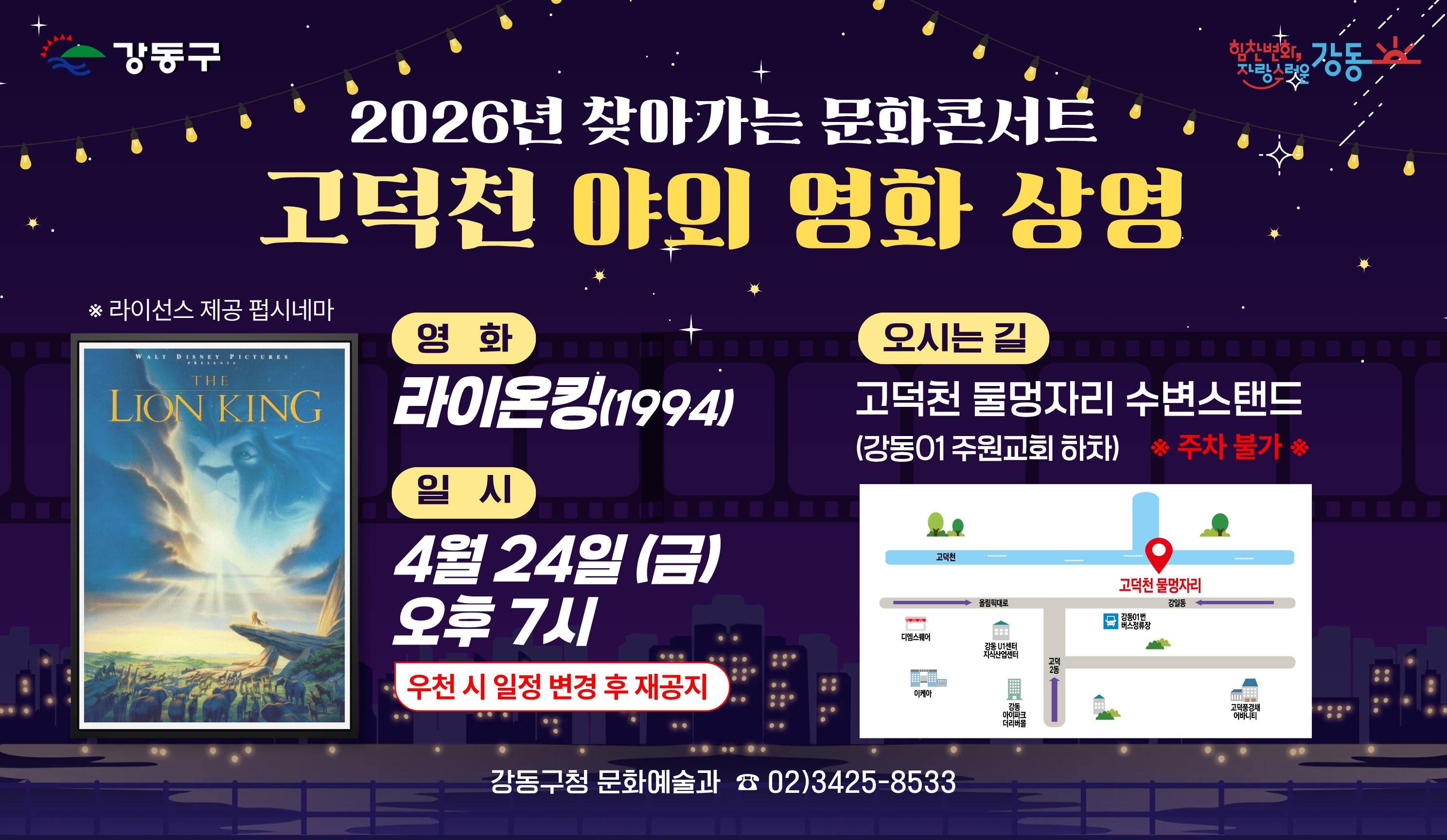 🌙 고덕천 야외 영화 상영 <라이온킹(1994)> 따뜻한 봄밤, 고덕천에서 즐기는 야외 영화 한 편 어떠세요? 😊 가족, 친구, 연인과 함께 편하게 오셔서 힐링하고 가세요! 🗓 일시 2026. 4. 24.(금) 19:00 📍 장소 고덕천 물멍자리 수변스탠드 (강동01 주원교회 하차) 🚫 안내사항 고덕천 주변 도로변은 주·정차가 불가하오니 가급적 대중교통 이용을 부탁드립니다. 🌧 우천 시 안내 기상 상황에 따라 일정이 변경될 수 있으며, 변경 시 홈페이지 공지를 통해 안내드릴 예정입니다. 🎟 관람 방법 무료 / 별도 신청 없이 현장 방문 자율 관람 🧣 꿀팁 하나! 야외 상영이라 일교차가 있을 수 있어요. 가벼운 겉옷 하나 챙겨오시면 더 쾌적하게 즐기실 수 있습니다 :) 👉 돗자리나 방석 챙겨서 오시면 더 여유롭게 즐기실 수 있어요! 👉 좋은 자리 선점은 조금 일찍 오시는 센스 ✨