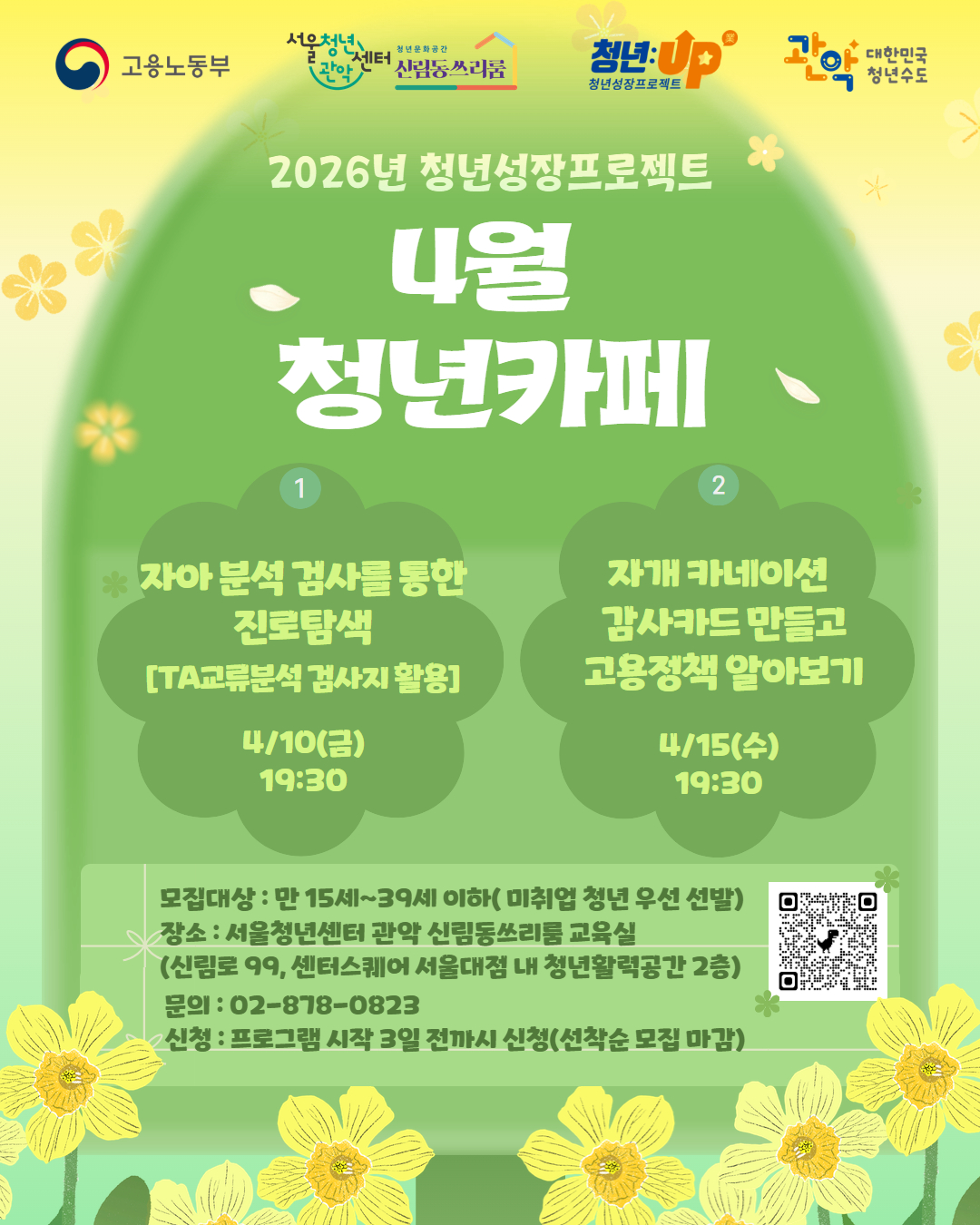 안녕하세요:) 서울청년센터 관악 신림동쓰리룸입니다! 2026년 고용노동부와 관악구와 함께하는 <청년성장프로젝트> 4월 첫 프로그램 모집이 시작되었습니다! 청년성장프로젝트의 2026년 4월 청년카페의 시작으로 - 자아 분석 검사를 통한 진로탐색 - 자개 카네이션 감사카드 만들고 고용정책 알아보기 프로그램을 준비했습니다. 참가를 희망하시는 분은 아래의 설문지에 응답 부탁드립니다! 감사합니다. ✔️내 용 : 1. 자아 분석 검사를 통한 진로탐색 - 일시: 4월 10일(금) 오후 7시30분 - 내용: TA교류분석 검사지를 활용하여 진로탐색을 진행합니다. - 장소: 서울청년센터 관악 신림동쓰리룸 교육실(서울시 관악구 신림로 99, 센터스퀘어 서울대점 내 청년활력공간 2층) 2. 자개 카네이션 감사카드 만들고 고용정책 알아보기 - 일시: 4월 15일(수) 오후 7시30분 - 장소: 서울청년센터 관악 신림동쓰리룸 교육실(서울시 관악구 신림로 99, 센터스퀘어 서울대점 내 청년활력공간 2층) ✔️모집대상 : 만 15세 ~ 39세 이하 [교육기관 재학생은 참여 불가능합니다. 단, 각급 학교 졸업 예정 학년(예:대학교 4학년), 학업과 취업을 병행할 수 있는 사이버대, 방송통신대, 야간대학 재학생은 참여가능] ✔️신청기간 : 해당 프로그램 시작 3일 전까지 신청(선착순 모집 마감, 미취업 청년을 우선 선발합니다) ✔️신청방법 : 고용24, 구글폼 신청 (접수 확인 및 초기 상담은 개별로 이루어집니다.) https://forms.gle/HMRTbCCLPD8ZVU4f6 ✔️문 의 : 서울청년센터 관악 청년문화공간 신림동쓰리룸 (T. 02-878-0823 / 010-2154-6214 / yc_ga@syc.seoul.kr) ※ 초기 상담 진행을 위해 연락(T. 02-878-0823/010-2154-6214) 드릴 예정이니, 해당 번호로 오는 연락에 꼭 회신 부탁드립니다.
