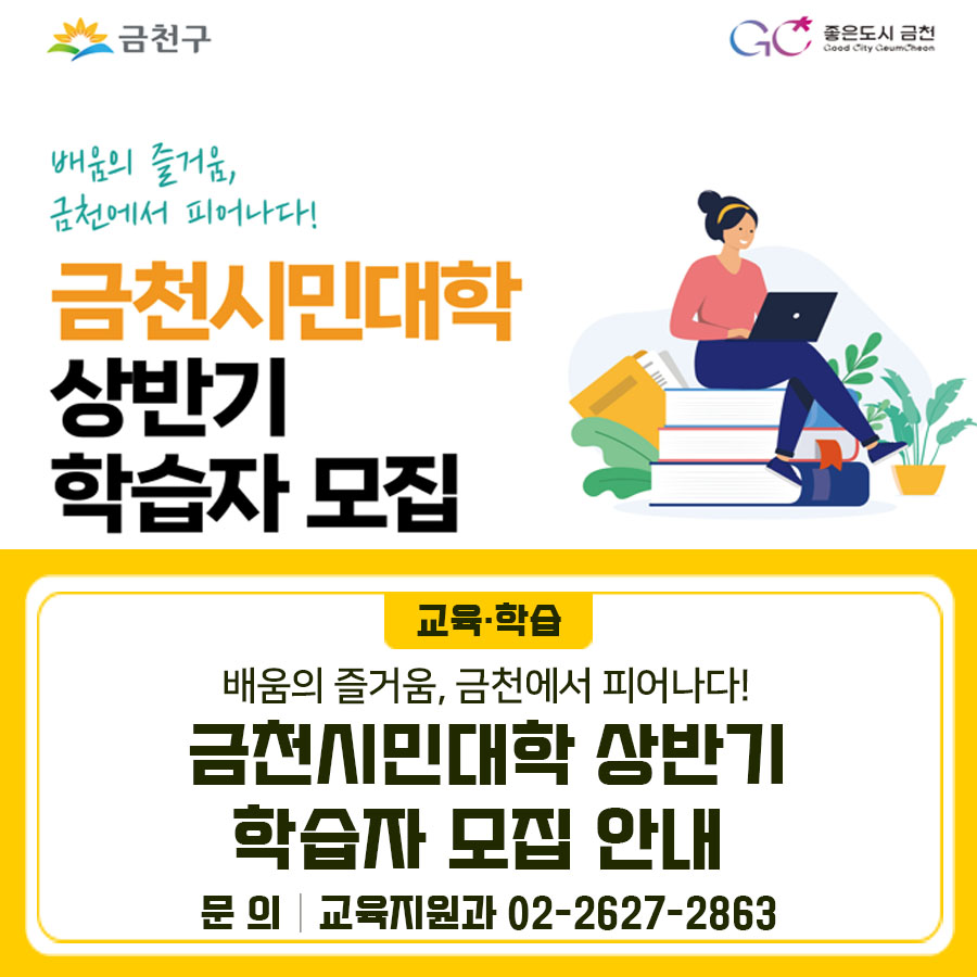 배움의 즐거움, 금천에서 피어나다! 금천시민대학에서 상반기 학습자를 모집합니다🔍 모집기간 2026. 3. 3.(화) 10:00부터 ※ 선착순 모집 교육일정 2026. 4. 1. ~ 6. 30. ※ 과정별 상이 모집대상 금천구민 및 관내 직장인 수강료 무료(교재비 및 재료비 개인부담) 신청방법 온라인 접수(금천교육포털 > 강좌신청 > 강좌명 검색) 교육/강좌 - 통합예약 전체보기 평생학습...