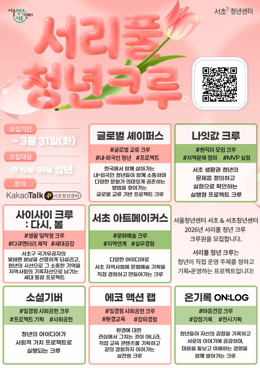 🌷 2026 서리풀 청년 크루 모집 🌷 청년이 직접 기획하고, 실행하며, 경험과 성장을 만들어가는 서리풀 청년 크루 크루원을 모집합니다! 서리풀 청년 크루는 단순 참여가 아닌, ✔ 내가 하고 싶은 프로젝트를 함께 만들고 ✔ 다양한 청년들과 함께 실행하며 ✔ 의미 있는 결과를 만들어가는 활동입니다 문화예술, 사회공헌, 글로벌 교류, 마음건강 등 7개의 다양한 크루 중 나에게 맞는 활동을 선택해보세요✨ 청년의 아이디어가 현실이 되는 경험, 지금 함께 도전해보세요! 📅 모집기간: ~3월 31일(화) 📍 신청: 포스터 QR 확인 / 서초청년센터 홈페이지