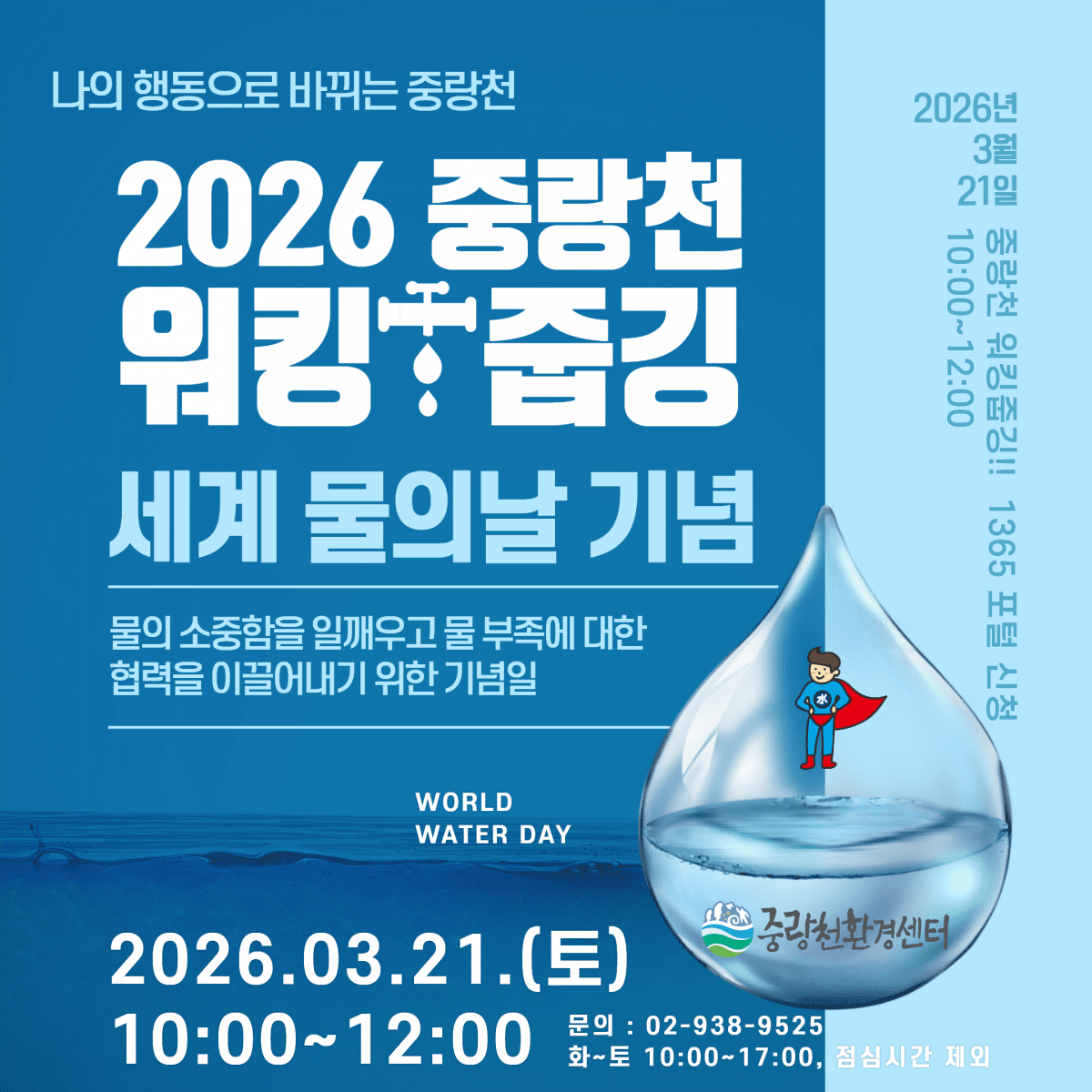 중랑천환경센터 <2026 세계 물의 날 기념, 중랑천 워킹줍깅> 1. 일시: 2026년 3월 21일 (토) 10:00 ~ 12:00 (봉사인증 2시간) 2. 대상 : 중랑천을 사랑하는 사람 누구나(초등생의 경우 보호자와 함께 참여 가능) 3. 장소 : 중랑천환경센터 (변경시 안내) 4. 내용: 하천 쓰레기 줍기 & 캠페인 - 중랑천환경센터 야외 무대 : 출석체크 및 활동 안내 - 하천 현장 : 지도 강사의 안내로 하천 구간 별 워킹줍깅(코스는 활동시간에 맞추어 변경될 수 있음.) - 줍깅 로드 1 : 센터 ~ 당현천 상계역 인근 왕복 - 줍깅 로드 2 : 센터 ~ 중랑천 ~ 경춘철교 ~ 경춘선공원 왕복 * 신 청 : 1365 포털 사이트 신청 바로가기 5. 개인 준비물 : 개인 장갑, 종량제 쓰레기봉투 10L(노원구 또는 서울시), 운동화 착용, 필요시 마실 물