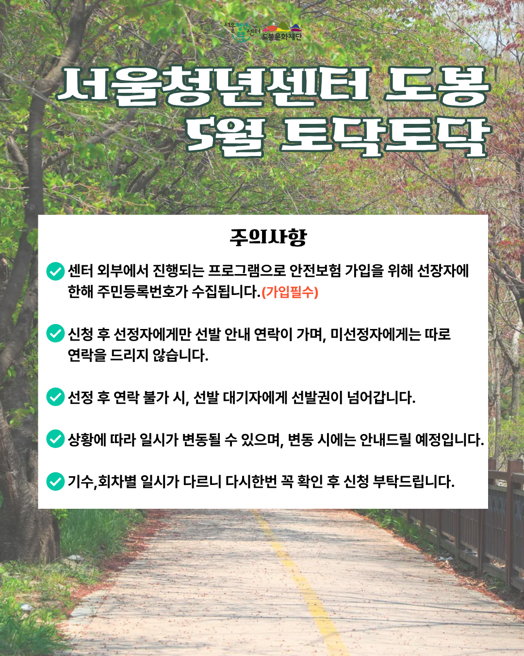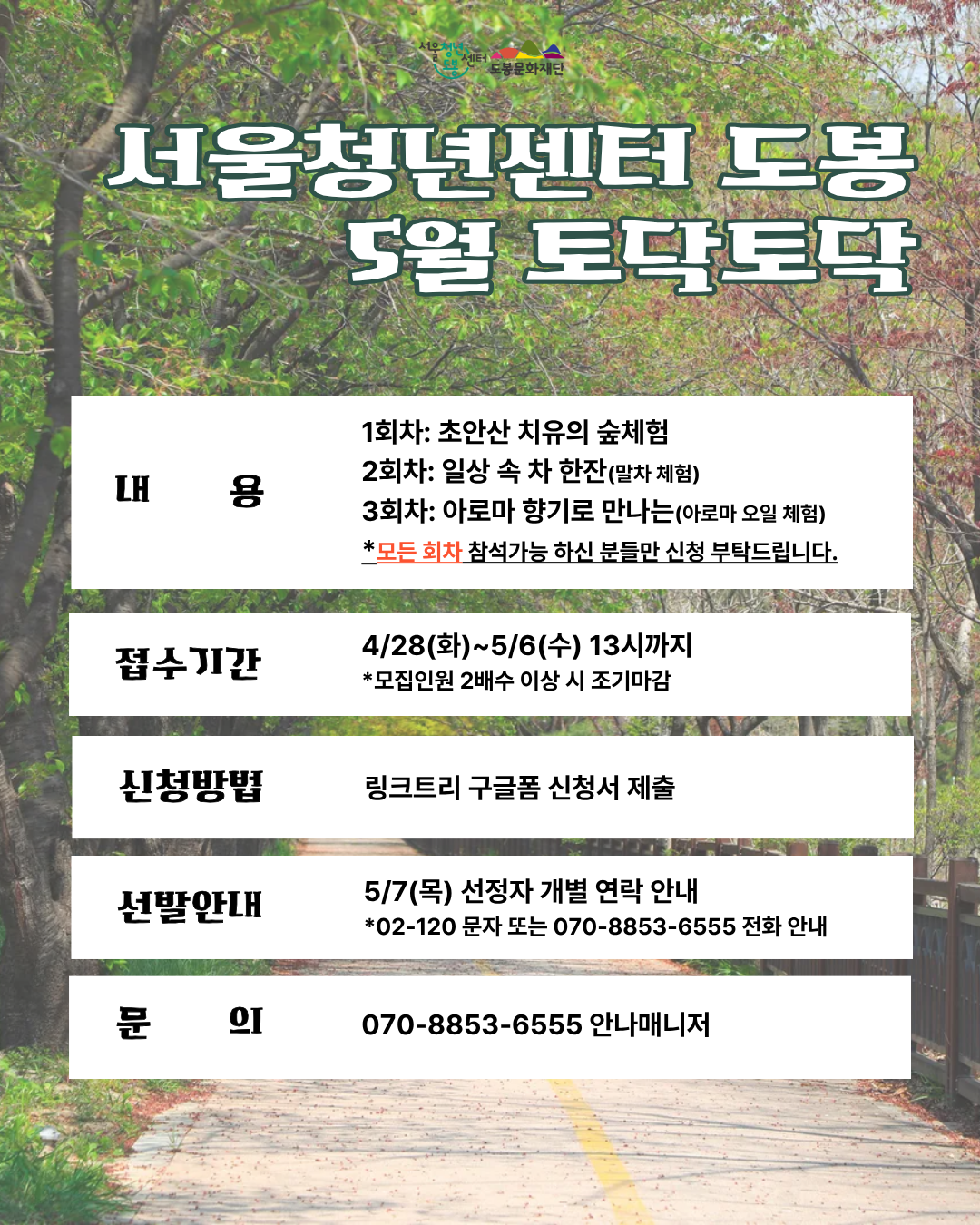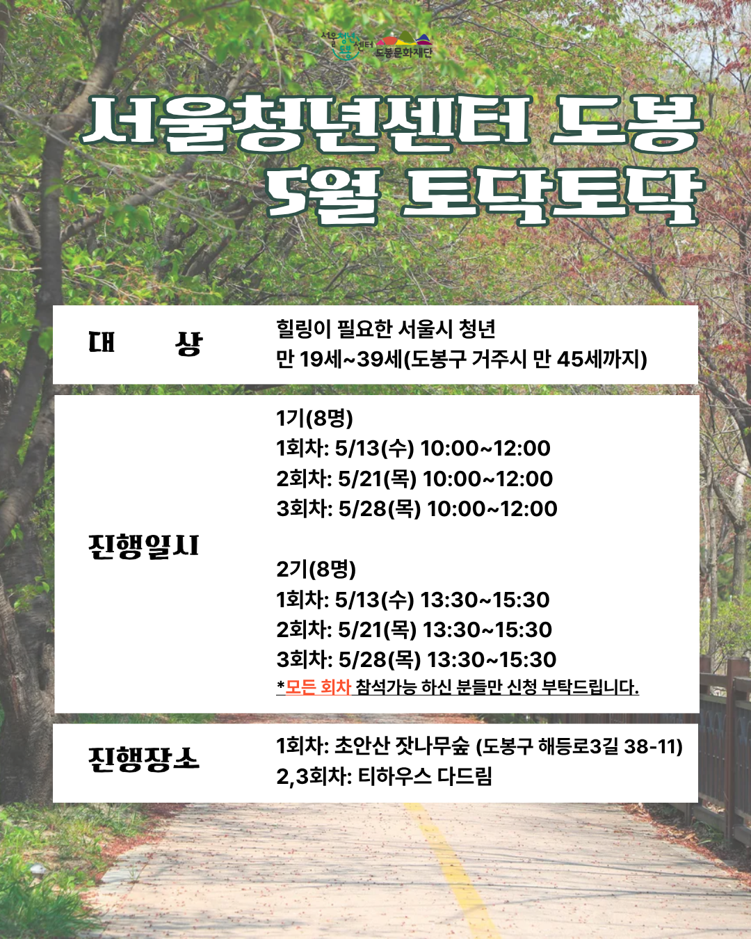 안녕하세요. 서울청년센터 도봉 안나 매니저입니다. 5월 [토닥토닥] 힐링 프로그램: 나를 위한 숨표 지치기 쉬운 일상 속에서 잠시 멈춰 서고 싶은 청년들을 위해 준비했습니다. ✨ 이런 분들께 적극 추천해요! ✅ 도심 속 소음에서 벗어나 자연의 소리에 귀 기울이고 싶은 분 ✅ 차 한 잔의 여유와 깊은 향기로 내면을 돌보고 싶은 분 ✅ 나에게 꼭 맞는 ’나만의 힐링 루틴‘을 찾고 싶은 분 ✨모집대상 힐링이 필요한 서울시 청년 최대 16명 (만 19세~39세, 도봉구 거주시 만 45세까지) ✨진행일시 및 진행장소 1기 (8명) - 1회차: 5/13(수) 10:00~12:00 (초안산 잣나무숲) - 2회차: 5/21(목) 10:00~12:00 (티하우스 다드림) - 3회차: 5/28(목) 10:00~12:00 (티하우스 다드림) 2기 (8명) - 1회차: 5/13(수) 13:30~15:30 (초안산 잣나무숲) - 2회차: 5/21(목) 13:30~15:30 (티하우스 다드림) - 3회차: 5/28(목) 13:30~15:30 (티하우스 다드림) ※기수 및 회차별 진행장소, 시간이 다르니 다시한번 확인 부탁드립니다! ※모든 회차 참석가능 하신 분들만 신청 부탁드립니다. ✨프로그램 내용 - 1회차: 초안산 숲체험 - 2회차: 말차체험 - 3회차: 아로마 인사이트 카드 체험 ✨모집기간 - 4월 28일(화) ~ 5월 6일(수) 13시까지 *모집인원 2배수 이상 시 조기마감 ✨신청방법 - 구글폼 링크 신청 → https://forms.gle/X2vHcNHHKJ7BeNw27 ✨선발안내 - 5/7(목) 선정자 개별 연락 안내 *02-120 문자 또는 070-8853-6555 유선전화 확인 필수 ✨문의 070-8853-6555 안나 매니저 📌주의사항(꼭 읽어주세요!) - 선발 여부는 문자 또는 유선전화로 안내됩니다. 선정 후 연락 불가 시, 선발 대기자에게 선 발권이 넘어갑니다. (02-120 문자 또는 070-8853-6555 유선전화 확인 필수!) - 선정 후 선정자에게만 선발 안내 연락이 가며, 미선장에게는 따로 연락을 드리지 않습니다. - 센터 외부에서 진행되는 프로그램으로 안전보험 가입을 위해 선정자에 한해 주민등록번호가 수집됩니다. 가입을 원하지 않으시는 경우, 참여가 불가능합니다. - 30분 이상 지각, 노쇼, 중간 결석 시 프로그램 참여가 제한될 수 있습니다. - 진행 예정 시간은 약 2시간이나, 상황에 따라 일찍 또는 늦게 종료될 수 있습니다.
