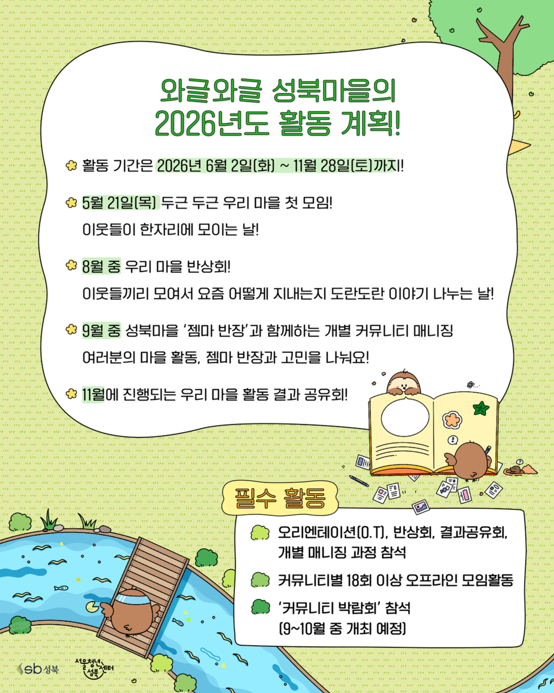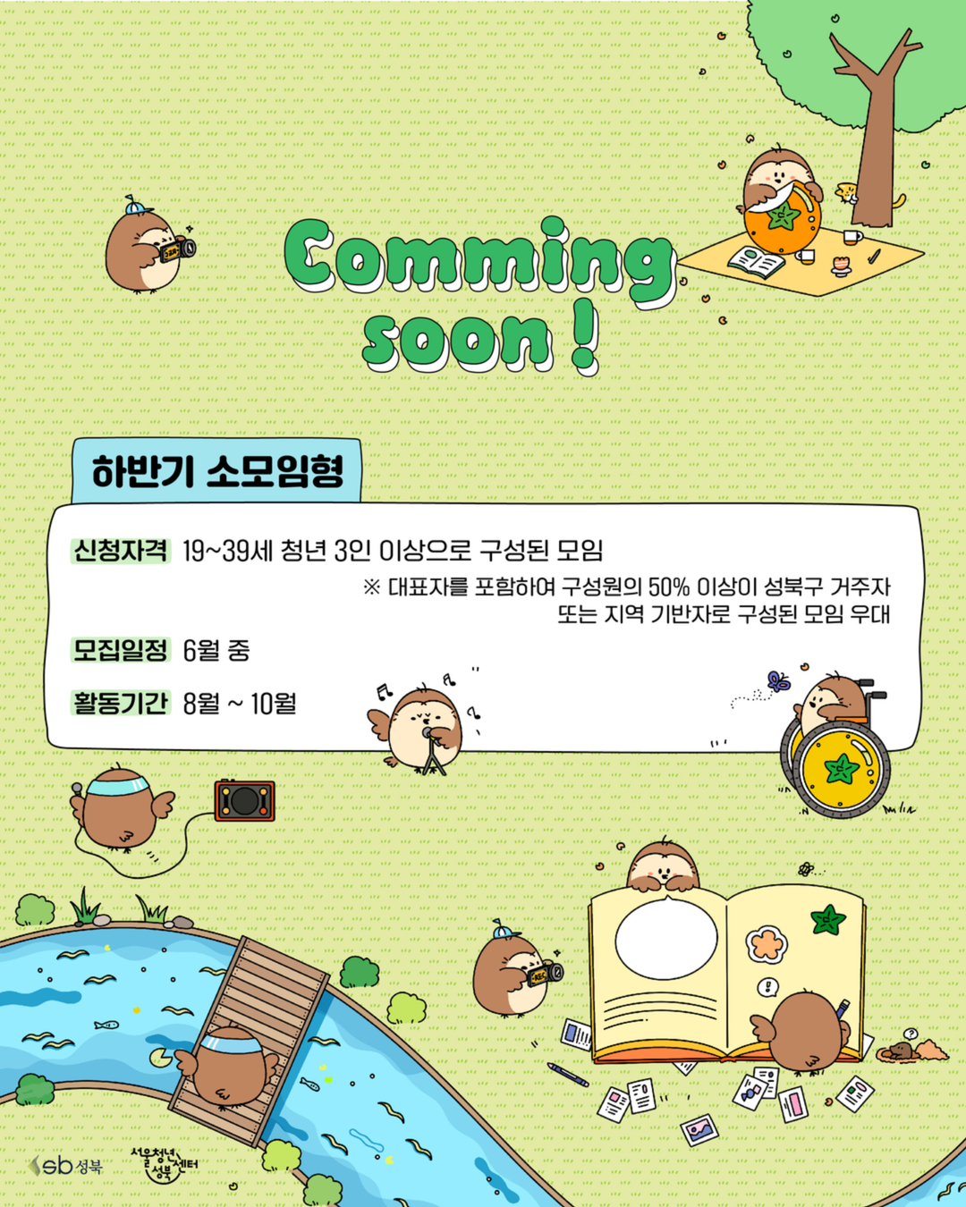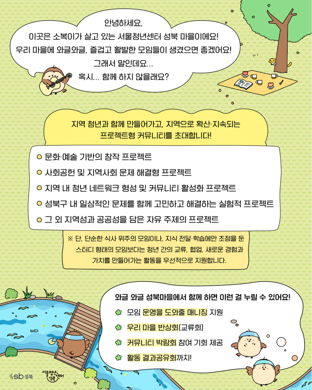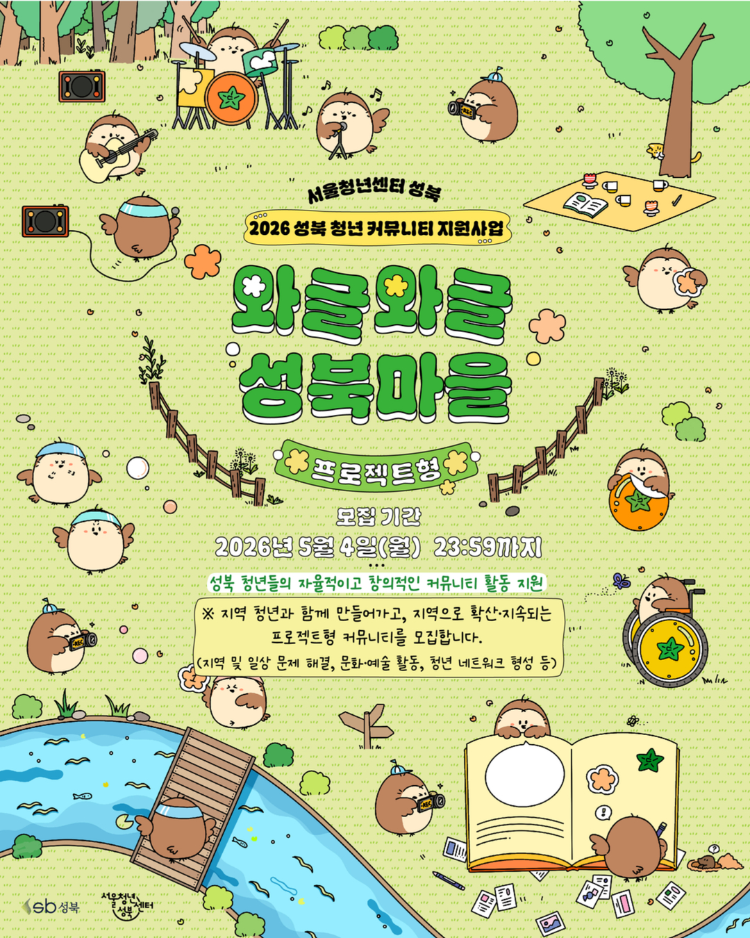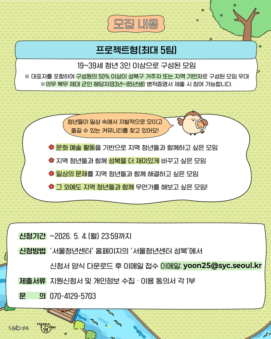 2026 년 성북 청년 커뮤니티 지원사업 「 와글와글 성북마을 」 프로젝트형 모집 - 프로젝트 형 모집 - 안녕하세요 ! 💕 소복이가 살고 있는 서울청년센터 성북 마을 반장 젬마입니다 💕 우리 마을에 와글 와글하고 즐겁고 활발한 모임들이 많아졌으면 좋겠어요 !! 그래서 말인데요 .. 혹시 .. 함께 하지 않을래요 ? 서울청년센터 성북의 성북 청년 커뮤니티 지원사업 「 와글와글 성북마을 」 은 성북 청년들의 자율적이고 창의적인 커뮤니티 활동을 지원합니다 ! ※ 지역 청년과 함께 만들어가고, 지역으로 확산 · 지속되는 프로젝트형 커뮤니티를 모집합니다. (지역 및 일상 문제 해결, 문화 · 예술 활동, 청년 네트워크 형성 등) 🔸 모집기간 🔸 2026 년 5 월 4 일(월) 23 :59 까지 , 이메일 접수 🔸 모집대상 🔸 성북구 거주 또는 활동 ( 예정 ) 하고 있는 3 인 이상의 청년 (19~39 세 ) 으로 구성된 모임 ( 최대 5 팀 ) ※ 대표자를 포함하여 구성원의 50% 이상이 성북구 거주자 또는 지역 기반자로 구성된 모임 우대 ※ 의무 복무 제대 군인 해당자 (83 년 ~85 년생 ) 병적증명서 제출 시 참여 가능합니다 . 🔸 면접 심사 안내 🔸 서류 발표 : 5 월 7 일(목) 면접 심사 : 5 월 12 일(화) 14:00 ~ ※ 면접 심사 시간은 서류 심사 이후 개별 연락 예정입니다 . 🔸 최종 선정 결과 🔸 최종 결과 : 5 월 15 일(금) ※ 선정자 발표 일정은 내부 상황에 따라 변동될 수 있습니다 . 🔸 지원내용 🔸 활동비 팀당 최대 300 만원 지원 ( ※ 9 월 중 서울청년센터 성북에서 주최하는 ‘ 성북 커뮤니티 박람회 ’ 참여 커뮤니티 대상 최대 10 만원의 운영지원비가 추가 지급됩니다 .) ✔️ 모임 운영을 도와줄 개별 커뮤니티 매니징 ✔️ 교류회 ✔️ 결과 공유회 ✔️ 커뮤니티 박람회 🔸 활동기간 🔸 6월 ~ 11 월 ※ 자세한 활동 일정은 첨부된 모집 안내문을 참고해주세요 ! 🔸 신청방법 🔸 청년몽땅정보통에서 신청서 다운로드 및 작성 후 이메일 접수 (yoon25@syc.seoul.kr) ❌ 현장 및 우편접수 불가 ❌ 🔸 문의 🔸 서울청년센터 성북 커뮤니티 담당자 ( 젬마 매니저 ) ☎ 070 – 4129 – 5703