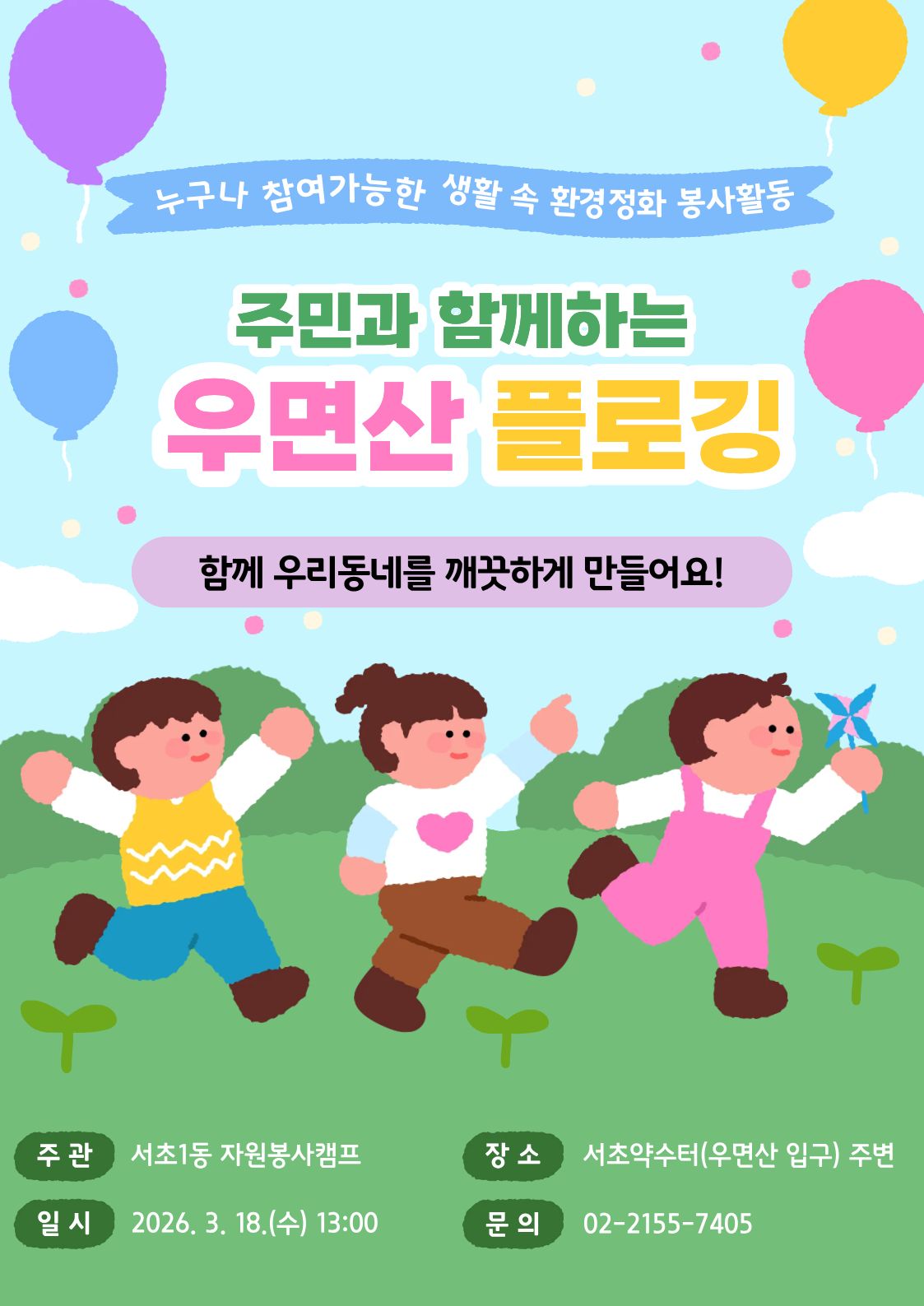 < 서초1동자원봉사캠프와 함께하는 우면산 플로깅 봉사활동 안내 > 우면산 입구(서초약수터) 주변을 걸으며 쓰레기를 줍는 플로깅 봉사활동을 진행합니다. 서초1동 자원봉사캠프와 함께 우리동네를 함께 깨끗하게 만들어주세요~! 작은 걸음이 큰 변화가 됩니다. 누구나 참여 가능하오니, 많은 관심과 참여 부탁드립니다☑️ 일 시 : 2026. 3. 18.(수) 1...