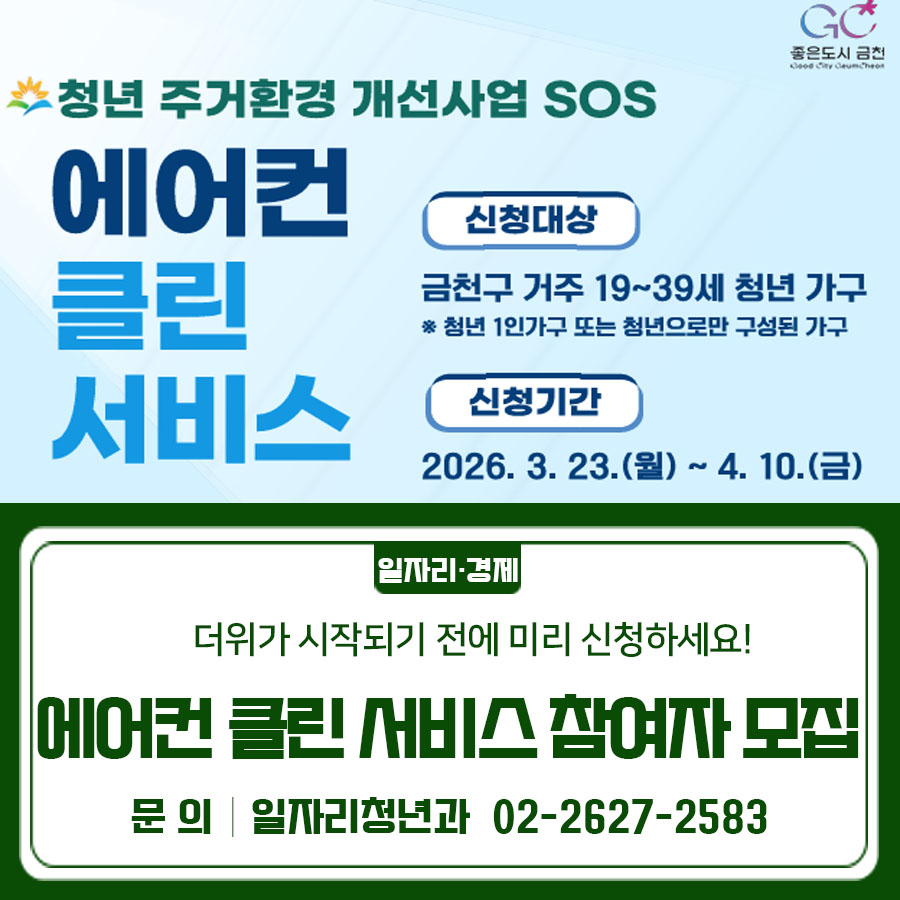 청년가구 에어컨 청소 지원🌿 최대 13만원 혜택! 지금 바로 신청하세요💙 지원대상 금천구 거주 청년가구(만 19세 ~ 39세) 지원내용 에어컨 분해 세척 및 살균 서비스 지원 지원규모 약 130가구 지원금액 가구당 최대 130,000원 이내(부가세 포함) 신청기간 2026. 3. 23.(월) ~ 4. 10.(금) 신청방법 이메일 접수(gckit@geumcheon.go.k...