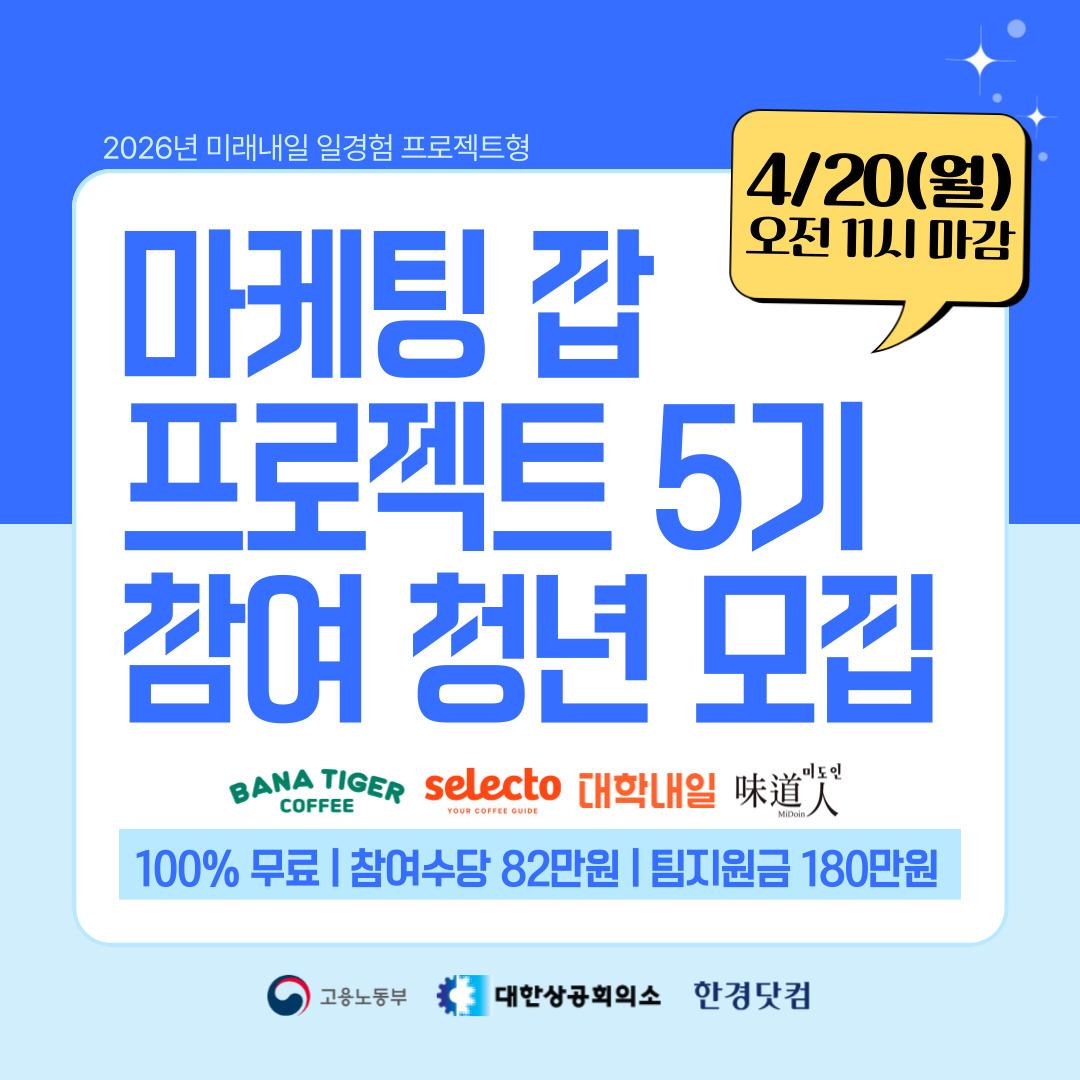 2026년 미래내일 일경험사업 한경닷컴 <마케팅 잡 프로젝트 5기> 참여 청년 모집(~4/20 오전 11시) 고용노동부, 대한상공회의소 지원사업으로 한경닷컴에서 운영하는 '마케팅 잡 프로젝트 5기'는 광고/홍보/마케팅 직무에 관심있는 청년들이 기업과 전문 멘토의 코칭에 따라 기업이 제안한 실무 마케팅 프로젝트를 8주간 수행하는 일경험 프로그램입니다. 📍모집 기간: ~ 2026. 4. 20(월) 오전 11시까지 신청 접수 📍모집 인원: 26명 📍모집 대상: ~ 만 34세 미취업 청년(졸업생 가능) 📍참가 비용: 무료✨ 📍참여 기업: 바나타이거커피, 셀렉토커피, 미도인, 대학내일 📍활동 기간 - 사전직무교육: 2026. 4.27.(월)~4.28.(화), 15시간 (2일, 9:30~18:00, 5호선 영등포구청역/양평역 근처, 오프라인 참여 필수) - 프로젝트: 2026. 4.29.(수)~6.23.(화), 8주 온오프라인 진행, 오프라인 최소 3회 이상 📍활동 혜택 - 광고/홍보/마케팅 사전직무교육 무료(교육 수당 2만원 지급) - 프로젝트 참여 수당 80만원 지급(8주) - 팀 지원금(프로젝트 실행비) 180만원 지급(8주, 팀별 지급) - 미래내일 일경험 수료증(고용노동부, 대한상공회의소) - 프로젝트 우수팀 한경닷컴 사장상 지급 - 광고 마케팅 직무 역량 셀프 진단 테스트 제공 📍신청 방법 ① 일경험 포털 신청 페이지: (마케팅 잡 프로젝트 5기) https://yw.work24.go.kr:443/d/a/prgmDtl/2bylhNc3pt ② 구글폼(희망 프로젝트 조사 등) https://forms.gle/W6xZ6uabrS21DqFv6 📍문의: jobproject@hankyung.com