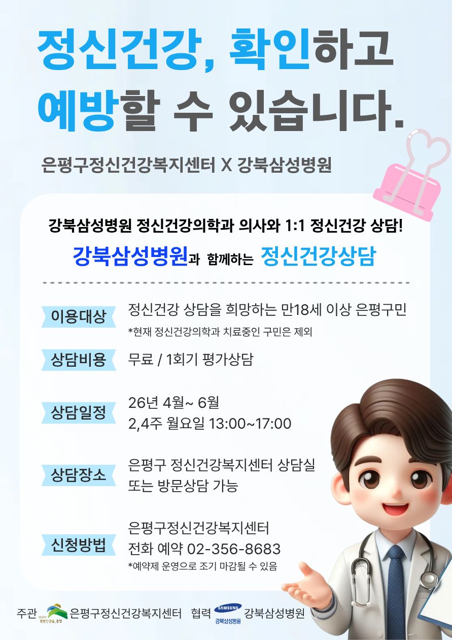 은평구정신건강복지센터 × 강북삼성병원 강북삼성병원 정신건강의학과 전문의와 함께하는 1:1 정신건강 상담 프로그램 이 운영됩니다.🩺 혼자 고민하기 어려웠던 마음 이야기, 전문의와 편안하게 나눠보세요 🙂 🧑 대상 정신건강 상담을 희망하는 은평구민 (만 18세 이상) ※ 현재 정신건강의학과 진료 중인 경우 제외 💰 비용 무료 📅 일정 2026년 4월 ~ 6월 (매월 2·4주 월요일 13:00 ~ 17:00) 📍 장소 은평구정신건강복지센터 상담실 또는 방문 상담 📝 신청 방법 전화 접수 📞 070-7335-1872 / 02-356-8683