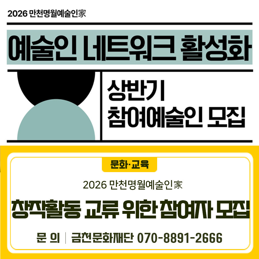 ‘만천명월예술인家’에서 창작·교류·협업의 기회를 만나보세요! 함께 연결되고, 함께 만들어가는 예술 활동에 지금 참여하세요✨ 주요내용 2026 ‘만천명월예술인家’ 예술인네트워크 활성화 상반기 참여 예술인 모집 모집기간 3/30(월) ~ 4/10(금) 18:00까지 활동기간 2026. 5. ~ 7. 대상 금천구 거주 및 활동 예술인 내용 예술인 간 교류·협업 및 창작·실험 ...