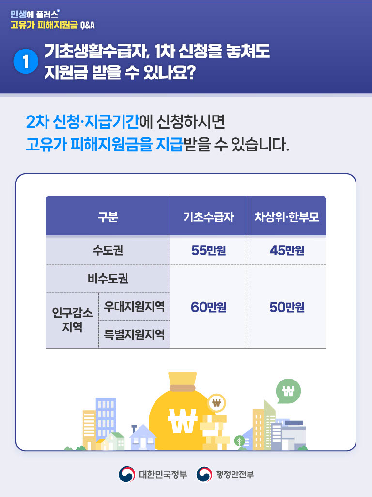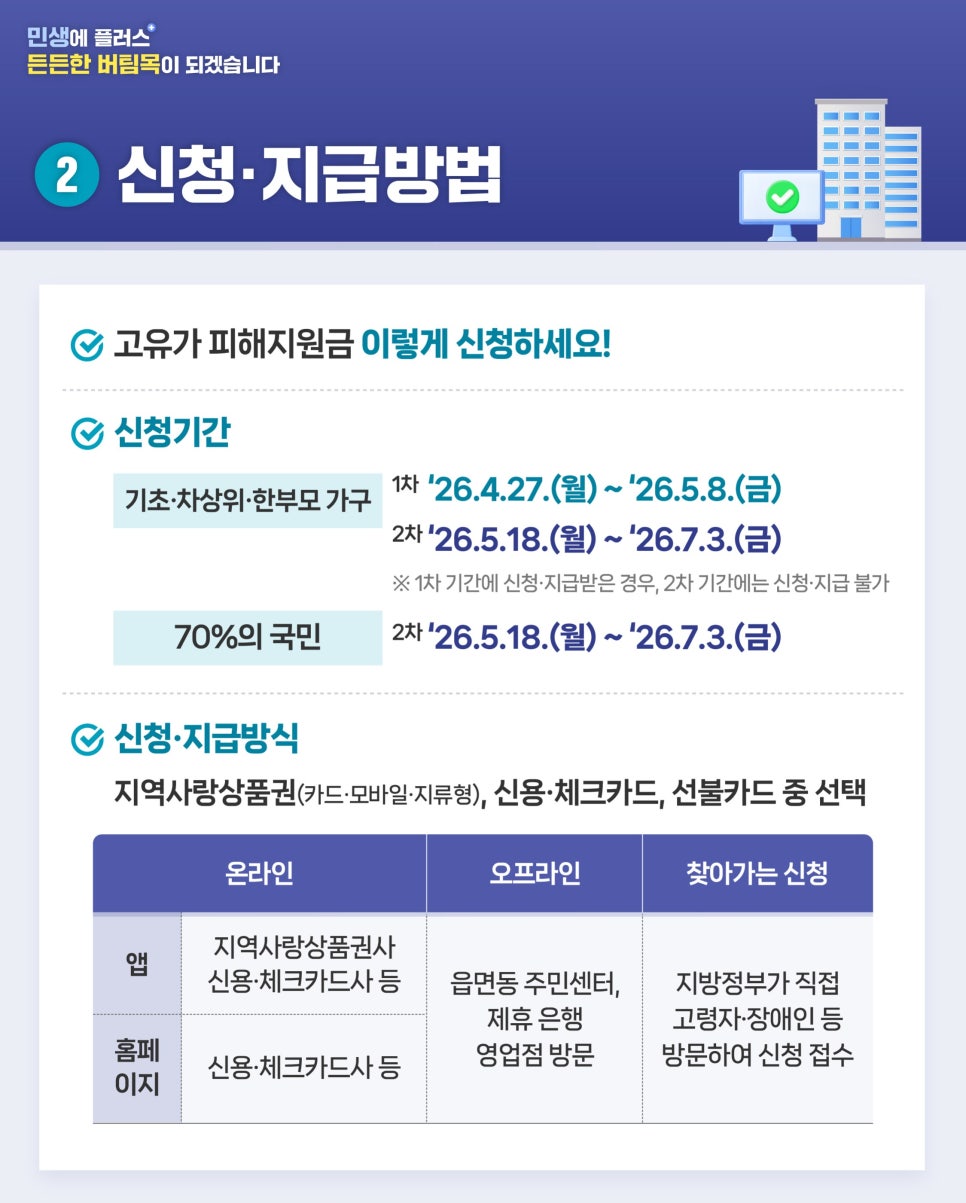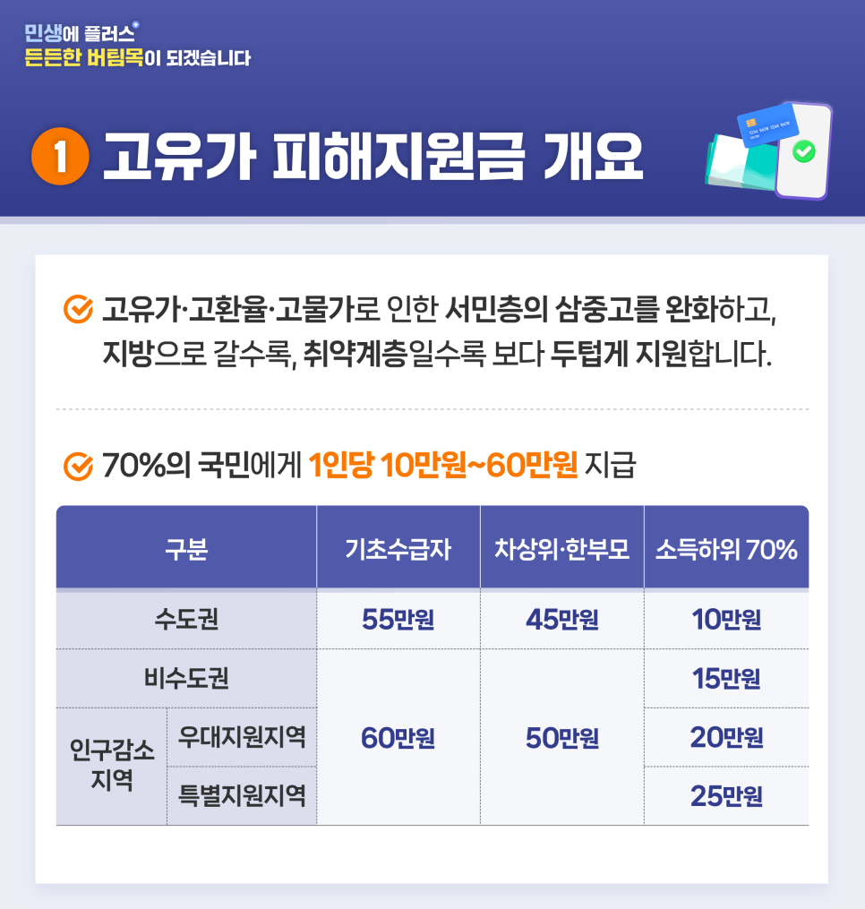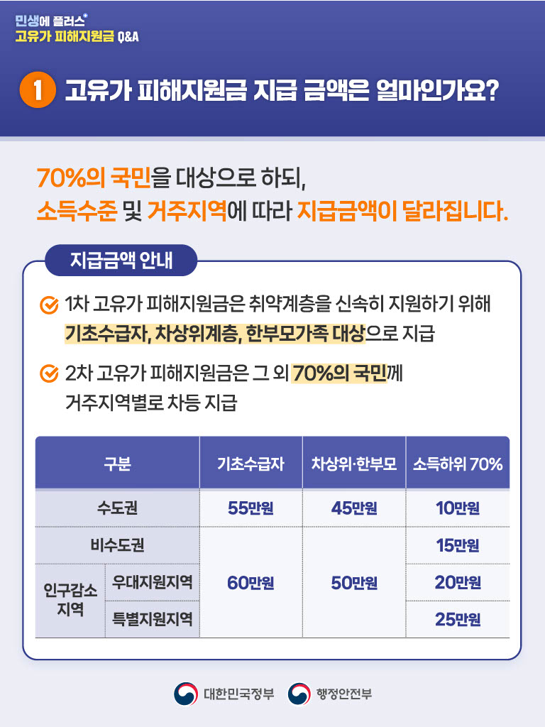 고유가·고환율·고물가로 인한 서민 생활 부담을 덜기 위해 '고유가 피해지원금'을 지급합니다. 관악구에서는 소득에 따라 최대 1인당 55만원까지 지원합니다. 신청방법과 지급일정을 확인하고 신청해 주세요. 📌대상 70%의 국민 📌규모 1인당 10~55만원 구분 소득 하위 70% 차상위·한부모 기초수급자 수도권 10만원 45만원 55만원 📌신청기간 기초·차상위·한부모 1차: '26. 4. 27....