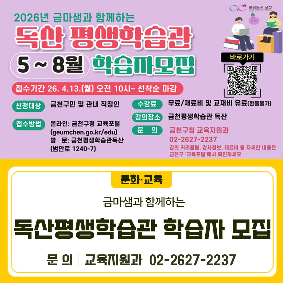 금마샘과 함께하는 금천독산평생학습관 학습자를 모집합니다💡 모집기간 2026. 4. 13.(월) 10:00 ~(선착순) 교육일정 2026. 5. 6. ~ 8. 13. ※과정별 상이 모집대상 금천구민 및 관내 직장인 신청방법 온라인 접수 교육/강좌 - 통합예약 전체보기 평생학습관 글로벌인재학당 글로벌인재학당 온라인 정보화교육 금천사이언스큐브 금천구보건소 동네배움터 금천시민대학 ...