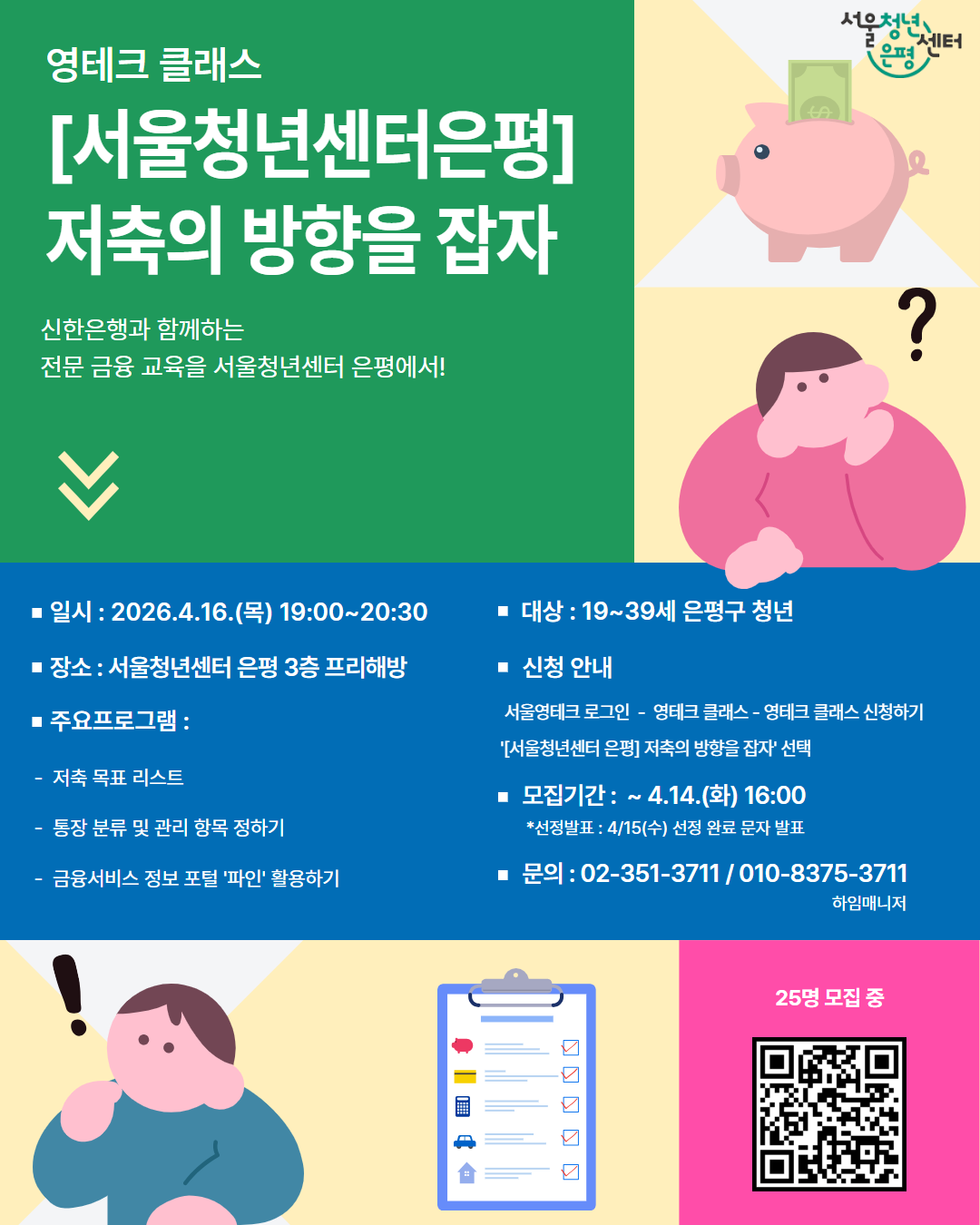 서울청년센터 은평 X 신한은행 <청년 경제·금융 교육> 저 축 의 방 향 을 잡 자! 참여자 모집 "아직도 남는돈으로 저축하고 있다구? 🤔" "왜 돈을 모야아 하는지 아직 모르겠다구?" 막막했던 내 통장, 기초부터 탄탄하게! 자산을 불리는 첫걸음을 서울청년센터 은평과 시작하세요. 🚀 ✨ 어떤 수업이 있나요? 💸저축 목표리스트 설정 📑 통장분류와 관리 항목 설정 💡 금융서비스 정보포털 안내 😃 참여 조건 - (필수) 4/8 공고일 기준, 만 19세 이상~39세 이하 청년 ※연령연장: 의무복무 제대군인은 복무기간에 비례하여 최대 3세까지 상한 연장 적용 - (우대)은평구 거주 또는 생활 청년 📆 교육 안내 일시: 2026. 4. 16.(목) 19:00~20:30 장소: 서울청년센터 은평 B동 3층 프리해방 📝 신청 방법 : 이미지 내 QR코드 스캔 또는 하단 링크 접수! > [서울청년센터 은평] 클래스 신청 https://youth.seoul.go.kr/youngtech/cls/list 📆신청 기간 : 4/8(수) ~ 4/14(화) 16:00까지 🔔참여자 선정 : 4/15(수) 선정자에 개별 안내 🙌문의 02-351-3711 / 010-8375-3711 * 문의 가능 시간 : 월~금 10:00 ~ 21:00 / 토 10:00 ~ 17:00 / 일, 공휴일 휴무