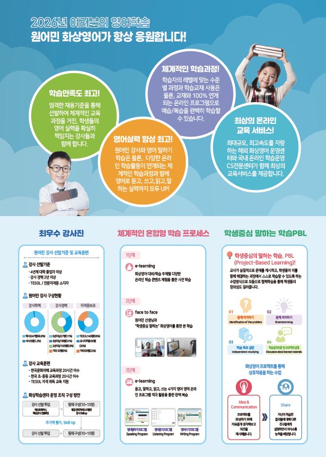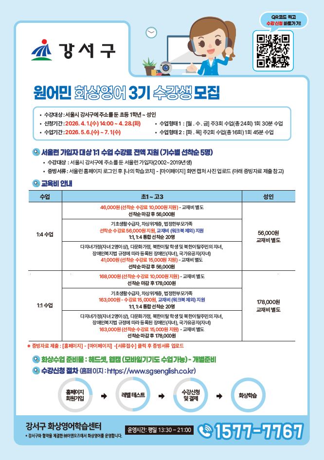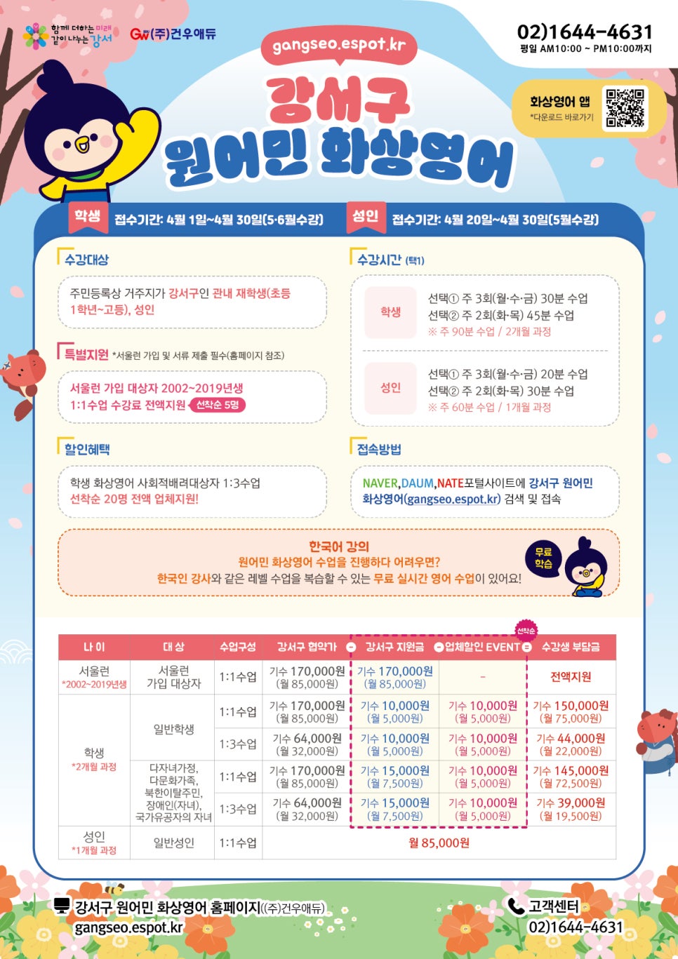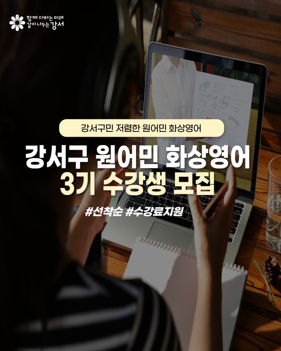 강서구에서는 초·중·고 학생부터 성인까지 참여할 수 있는 2026년 3기 원어민 화상영어 수강생을 모집합니다 😊 👩🏫 수강대상 강서구에 주민등록을 둔 초·중·고 학생 및 성인 💻 수강신청 (1) 건우애듀 신청기간: 2026. 4. 1.(일) ~ 4. 30.(목) 신청방법: 홈페이지 접속 후 수강신청 (https://gangseo.espot.kr) (2) 이앤오즈 신청기간: 2026....