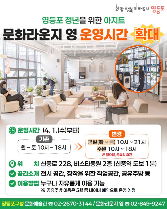 요즘 혼자 공부하거나 작업할 공간 찾기 쉽지 않죠? 카페는 오래 있기 부담스럽고, 조용하면서도 편하게 머물 수 있는 공간이 필요할 때가 많은데요☕ 영등포 청년들을 위한 아지트, 문화라운지 영이더 편리하게 이용할 수 있도록 운영시간을 확대했다는 소식입니다👏🏻⏰ 운영시간, 어떻게 바뀌었을까요? 기존에는 월요일 ~ 토요일 오전 10시 ~ 오후 6시 운영이었는데요. 4월...