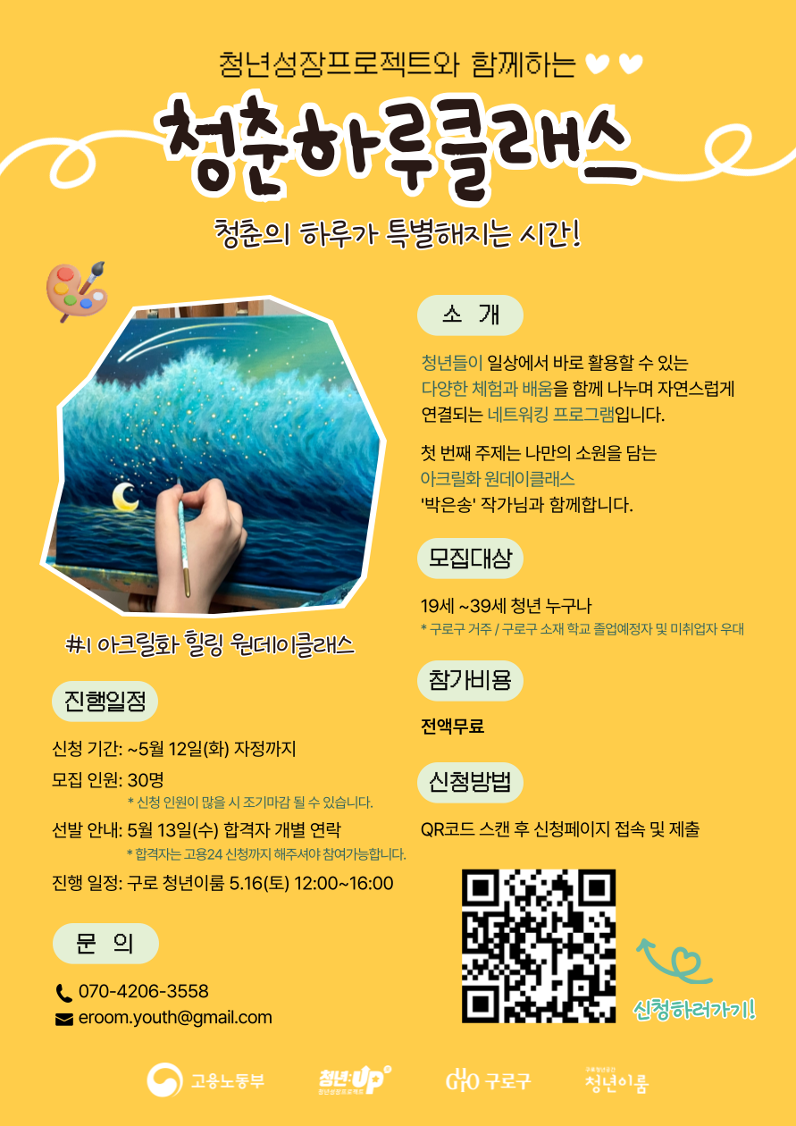 ♥ 프로그램 소개 청년들이 일상에서 바로 활용할 수 있는 다양한 체험과 배움을 함께 나누며 자연스럽게 연결되는 네트워킹 프로그램입니다. 첫 번째 주제는 나만의 소원을 담는 아크릴화 원데이클래스 '박은송' 작가님과 함께합니다. ♥ 모집대상 19세~39세 청년 누구나 * 구로구 거주 / 구로구 소재 학교 졸업예정자 및 미취업자 우대 ♥ 진행일정 - 5/16(토) 12:00~16:00 - 구로청년공간 청년이룸 (지하철 7호선 천왕역사 내 4번 출구에 위치) ♥ 모집안내 - 모집기간: ~5월 12일(화) 자정까지 - 모집인원: 총 30명 - 선발 안내: 5월 13일(수) 합격자 개별 연락 * 합격자는 고용24 신청까지 해주셔야 참여가능합니다. ♥ 참가비용 전액무료 ♥ 유의사항 - 당일 클래스 참여 취소는 불가합니다. * 당일 노쇼 발생 시, 추후 타 프로그램 참여가 제한될 수 있습니다. - 본 프로그램은 고용24 청년성장프로젝트 일환으로 운영되므로 선발자는 고용24 신청까지 진행주셔야 최종 참여가 가능합니다. * 최종 참여가능 확인 후 신청링크 발송 - 작가의 작품 이미지를 활용해 작업이 가능하며, 자유 그리기를 희망하실 경우 가로 33.4cm × 세로 24.2cm (캔버스 4F 크기)의 컬러 프린트 이미지를 미리 준비해 지참해주시기 바랍니다. ♥ 신청링크 https://miniintern.com/event/3149 ♥ 공식 홈페이지 및 SNS 공식 홈페이지 http://www.youtheroom.kr/main.php 인스타그램 https://www.instagram.com/youtheroom ♥ 문의사항 E-MAIL: eroom.youth@gmail.com TEL: 070-4206-3558 (평일 10시~18시 / 주말 및 공휴일 휴무)