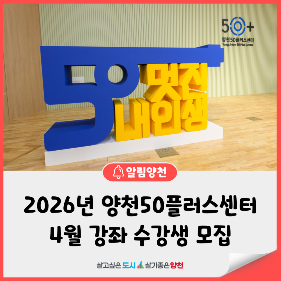 양천50플러스센터에서 2026년 4월 정규강좌 수강생을 모집합니다.😊 4월에는「펜 한자루, 선으로 보는 풍경 펜드로잉」을 포함해 취미·건강·디지털·취업연계 등 총 16개 강좌의 다양한 교육 프로그램이 진행되니! 중장년 여러분의 많은 참여 바랍니다. 모집기간: 2026. 3. 16.(월) ~ 모집 마감 시까지 모집대상: 40~64세(1962-1986) 양천구민 (우선순위)...