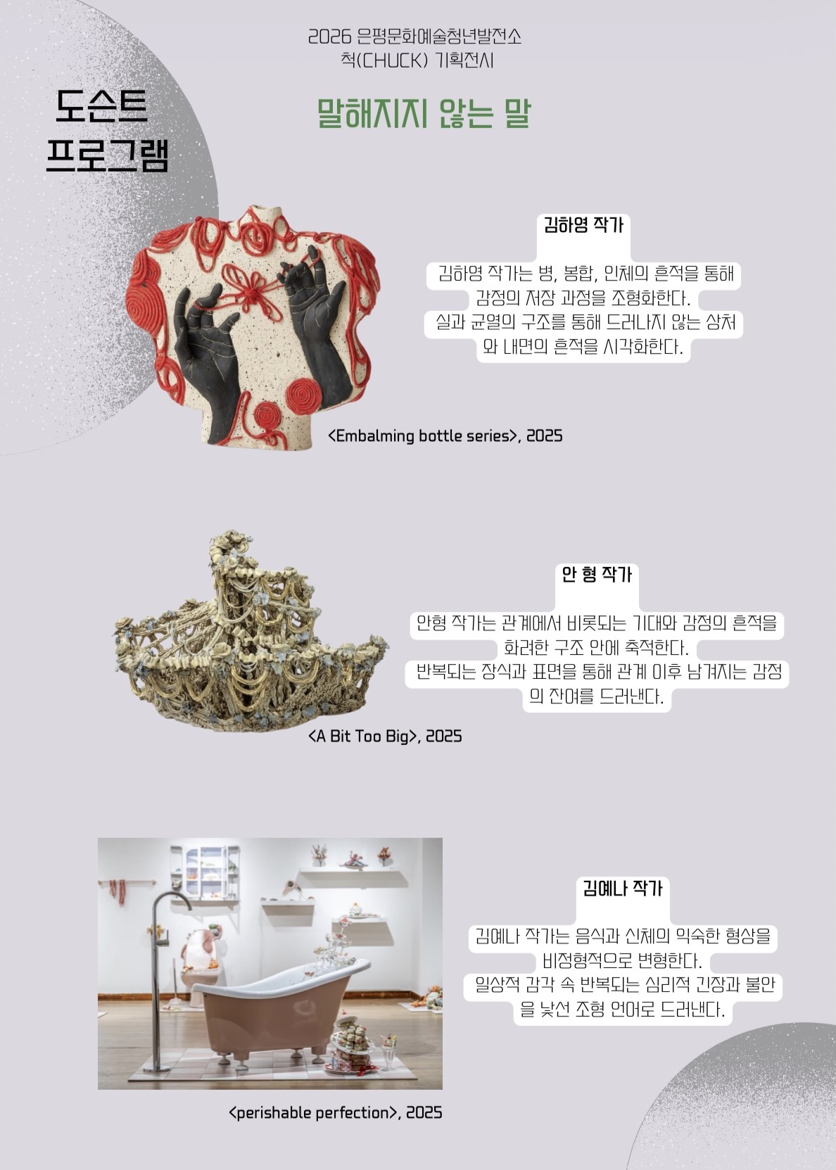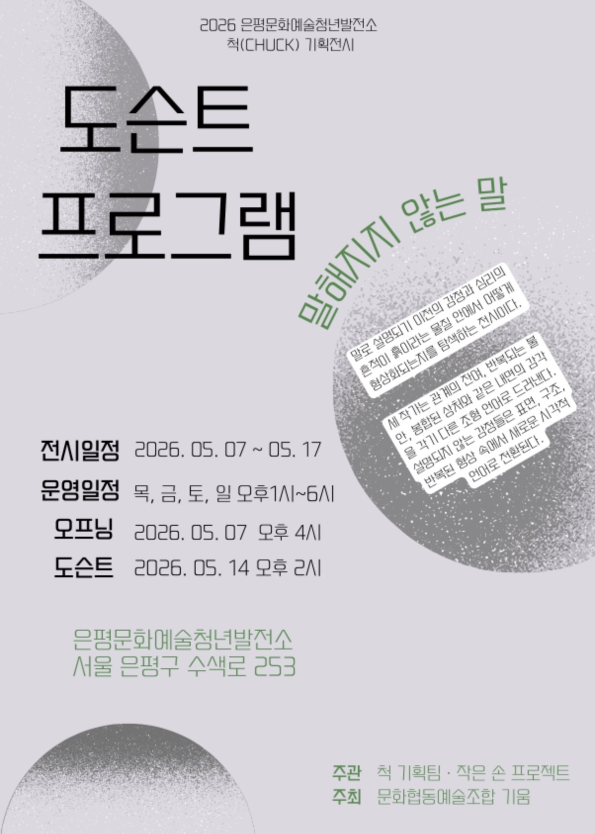 ○ 전 시 명 : 「말해지지 않는 말」 말로 설명되기 이전의 감정과 심히의 흔적이 흙이라는 물질 안에서 어떻게 형상화되는지를 탐색하는 전시이다. 세 작가는 관계의 잔여, 반복되는 불안, 봉합된 상처와 같은 내면의 감각을 각기 다른 조형 언어로 드러낸다. 설명되지 않는 감정들을 표면, 구조, 반복된 형상 속에서 새로운 시각적 언어로 전환된다. ○ 전시기간 : 2026. 5. 7.(목) ~ 5. 17.(일) ※ 월, 화, 수 휴무 ○ 전시장소 : 서울시 은평구 수색로 253, 은평청년문화예술발전소 ※ 수색역 1번출구에서 200m ○ 비 고 : 무료전시, 대중교통 이용 권장 ○ 운영시간 : 13:00 ~ 18:00 ○ 주최 : 문화예술협동조합 기움 ○ 주관 : 척 기획팀, 작은 손 프로젝트 ○ 참여작가 : 김하영, 안형, 김예나 ○ 도슨트 프로그램 일정 - 2026년 05월 14일 오후 2시 작가가 직접 운영하는 도슨트 프로그램 운영 ○ 참여링크 https://docs.google.com/forms/d/1pwsW8wC-3vSxUPUnBNYkmECguc6ZM7Xz40PnqyfvH3E/edit?ts=69e5cb0a