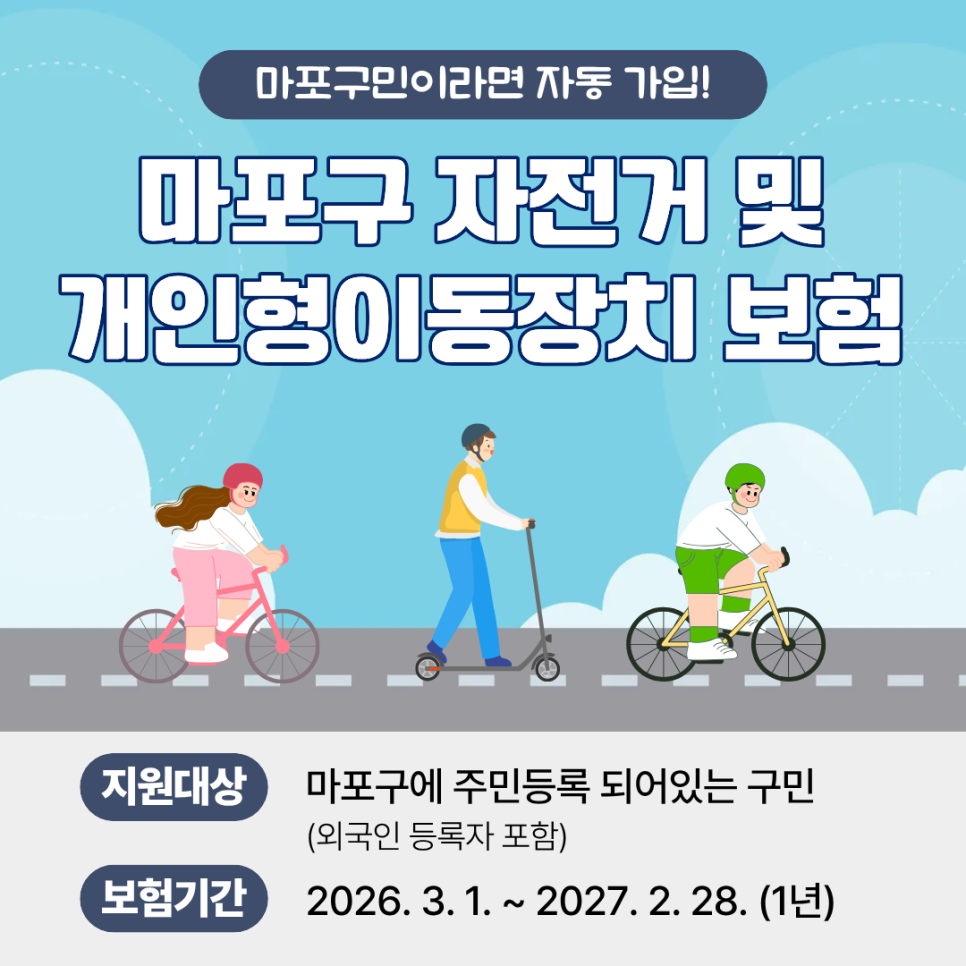 마포와 함께하는 안전한 2026년! 혹시나 일어날 수 있는 사고에 대비해서 마포구민이라면 누구나 자동가입되는 🙆🏻♀️🚲자전거 및 개인형이동장치 보험을 안내해드립니다~! 사고가 일어나지 않는 것이 최선이지만 혹시나 사고가 났을 때도 💥보험으로 지원받을 수 있는 만큼! 꼭 기억해두시길 바랄게요👍🏻 자전거 및 개인형이동장치(PM) 보험 🚲 보험기간 2026. 3. 1. ~ 2...