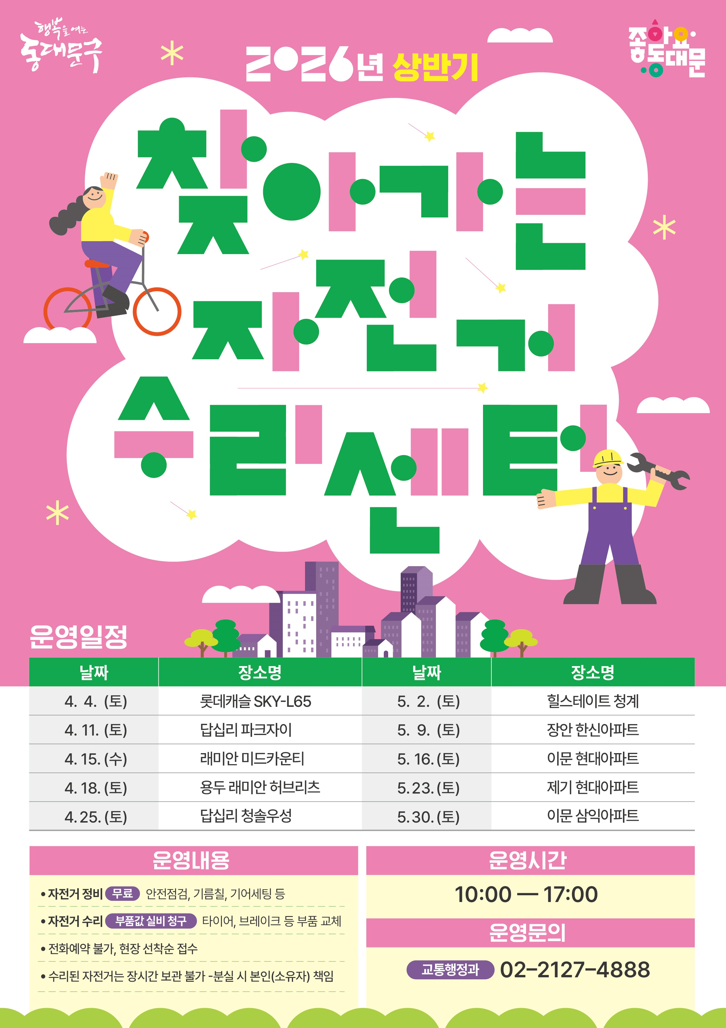 다시 돌아온 '찾아가는 자전거 수리센터', 이제 집 앞에서 만나요! 자전거 타기 딱 좋은 계절, 구민 여러분의 편의를 위해 자전거 수리센터가 운영을 재개합니다. 2026년 상반기에는 관내 공동주택을 중심으로 집 앞으로 직접 찾아가 무료로 정비해 드립니다. 소중한 내 자전거, 전문가의 손길로 더 안전하게 관리하세요! 구민 여러분의 많은 관심과 참여 바랍니다.