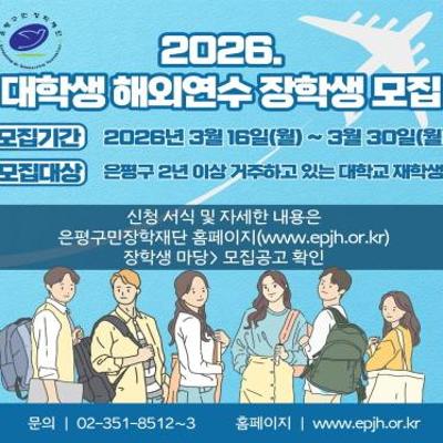 ✈️ 2026년 대학생 해외연수 장학생 모집 안내 해외에서 배우고, 경험하고, 성장할 기회! 2026년 대학생 해외연수 장학생 을 모집합니다 🙌 관심 있는 청년분들은 아래 내용 꼭 확인해보세요! 진로 은평구민장학재단 <2026년 대학생 해외연수 장학생> 모집 안내 신청기간 2026-03-16 ~ 2026-03-30 16 : 00 진행일정 대상 대학생 담당기관 기타 (은평구민장학재단) 담당기관 바로가기 상세정보 ✈️ 2026년 대학생 해외연수 장학생 모집 안내 해외에서 배우고, 경험하고, 성장할 기회! 2026년 대학생 해외연수 장학생 을 모집합니다 🙌 관심 있는 청년분들은 아래 내용 꼭 확인해보세요! 📌 모집 개요 선발 분야 : 대학생 해외연수 장학생 선발 인원 : 6명 내외 (예비합격자 2명 내외 별도 선발 가능) 📅 신청 기간 2026년 3월 16일(월) ~ 3월 30일(월) 오후 4시까지 ※ 마감 시간 이후 접수 불가하니 꼭 시간 확인해주세요! ✅ 신청 자격 아래 조건을 모두 충족 해야 합니다. ✔ 거주 및 학적 요건 공고일 기준, 주민등록상 은평구에서 2년 이상 거주하고 있는 대학교 재학생 (※ 2026년 1학기 휴학생, 졸업 예정자, 학점은행제·사이버대·방통대 제외) ✔ 소득 요건 2026년 1학기 학자금 지원구간 8구간 이내 ✔ 해외 연수 가능 요건 - 비자 및 해외여행 결격 사유 없음 - ESTA 발급 가능자 - 기본 영어 의사소통 가능자 🗓️ 선발 일정 서류 결과 발표 : 2026년 4월 9일(목) 면접 심사 : 2026년 4월 17일(금) 13:00 ~ 17:00 (개별 시간 별도 안내) 최종 합격 발표 : 2026년 4월 21일(화) 첨부파일 【붙임2】_신청서_2026_해외연수장학생_선발.hwp 【붙임1】_공고문_2026_해외연수장학생_선발_계획.pdf 목록