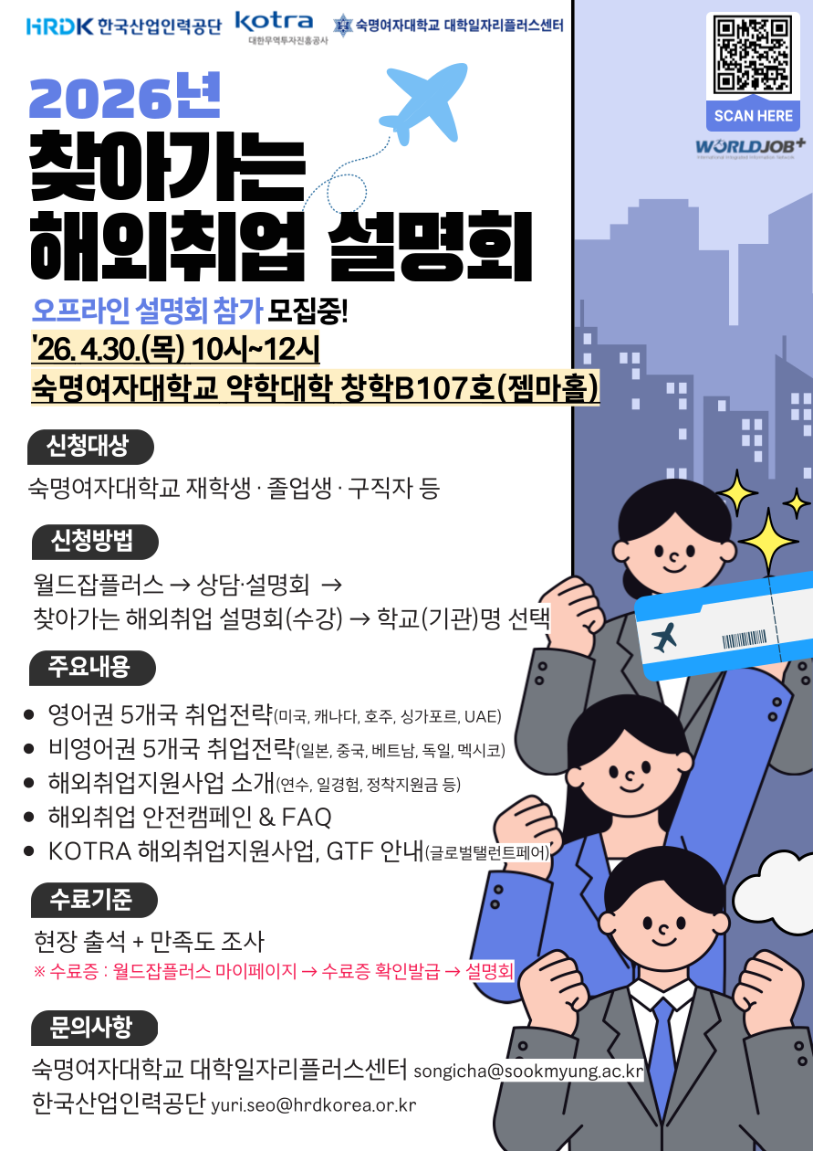 1. 목적: 해외취업을 희망하거나 관심있는 청년들을 위한 정보 제공 2. 신청 대상: 해외취업에 관심있는 숙명인 및 만 34세 이하 지역청년(관내 아니어도 참석 가능) 3. 신청 기간: ~ 2026.04.29(수) 4. 진행 일정 및 장소 가. 일정: 2026.04.30(목) 10:00-12:00 나. 장소: 숙명여대 제2캠퍼스 창학B107호(젬마홀) 5. 문의 연락처: 숙명여대 대학일자리플러스센터 / 02-2077-7131