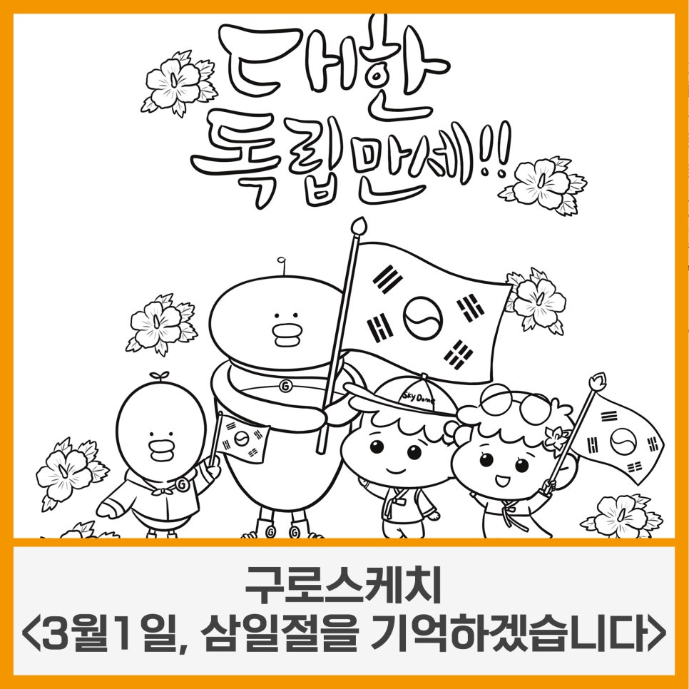 구로스케치 <3월1일, 삼일절을 기억하겠습니다> 구로구 소식지 <구로스케치> 구로에 예쁜 색을 입혀주세요! ▷ 선정된 분들에게 3만원 상당의 모바일 상품권을 드립니다! <그림> 이번 호 '구로스케치'는 '3월1일, 삼일절을 기억하겠습니다'입니다. 사진을 눌러 저장하시거나 첨부파일을 저장하여 예쁘게 색칠해 주세요. 🎨 <참여방법> 첨부파일 구로스케치(3월호).jpg 파일 다운로드...