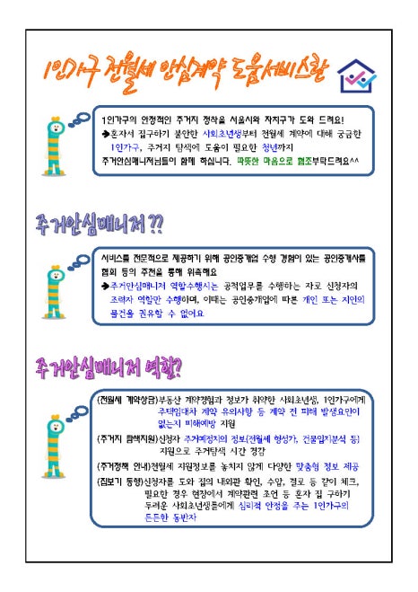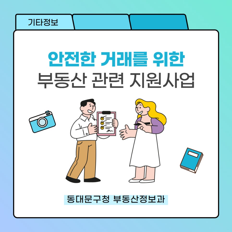 부동산 관련 지원사업 안내 중개보수 지원·반환보증료 지원·안심계약 서비스까지! 안전한 부동산 거래를 위한 사업들, 한 번에 모아서 알려드릴게요 ✅🔎 서울시 1인가구 전월세 안심계약 도움서비스 ✔ 운영기간: 2026. 1. 1. ~ 12. 31. ✔ 지원대상: 동대문구 거주 또는 거주예정인 1인가구 ✔ 상담일시: 매주 월·목요일 13:30~17:30(주2회, 4시간)...