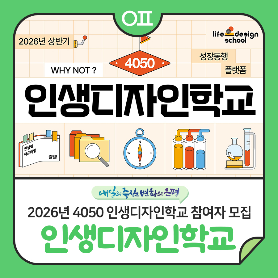 2026년 4050 인생디자인학교 참여자 모집 4050 중장년의 생애전환기 역량 개발을 위한 맞춤형 종합 교육 과정을 운영합니다. 「4050 인생디자인학교」 실효성 높은 진로 탐색 및 도전 기회를 놓치지 마시고 참여해 보세요~ ✅ 사업목적 중장년 세대의 주체적인 인생설계 역량 개발 및 생애 전환을 위한 실행 능력 강화 ✅ 모집기간 ~ 2026. 3. 29.(일) ✅ 모집대상 서울시...