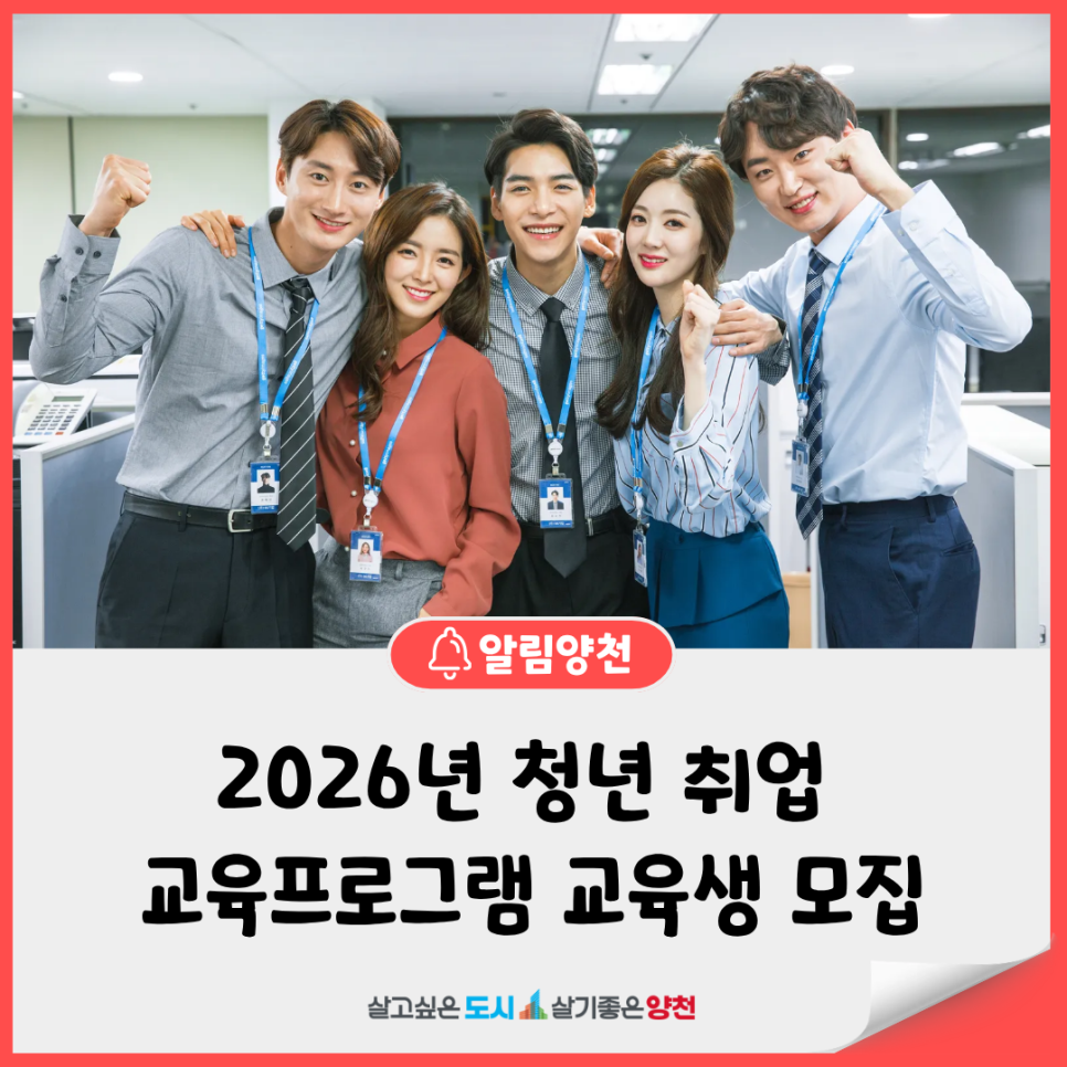 양천구에서는 관내 미취업 청년들의 실무 역량을 강화하고 안정적인 사회 진출을 돕기 위해 「2026년 청년 취업교육 프로그램」을 운영합니다. 본 프로그램은 전문 교육기관과 연계하여 실무 중심의 직업교육을 제공하며, 교육비는 전액 무료로 지원됩니다. 공항 보안, 타일 시공, AI 시험인증, 공항 지상직 등 각 분야의 전문가로 거듭날 양천구 청년분들의 많은 참여를 바랍니다. 2026...