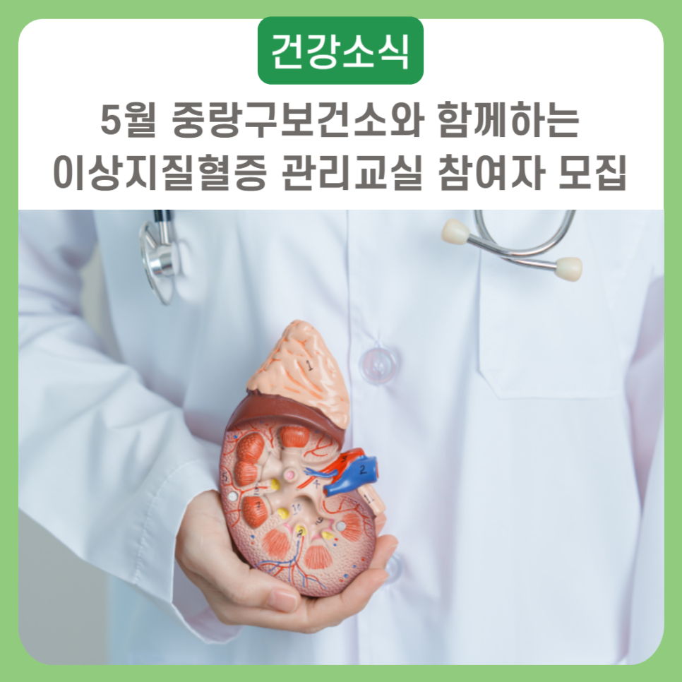 [건강소식] 5월 중랑구보건소와 함께하는 이상지질혈증 관리교실 참여자 모집 문의 : 중랑구보건소 건강증진과(☎ 02-2094-0673) 이상지질혈증 질환자 및 관심있는 중랑구민을 대상으로 5월 중랑구보건소와 함께하는 이상지질혈증 관리교실 참여자를 모집합니다. ※ 4월 13일(월)부터 선착순 마감 시까지 이상지질혈증에 대해 바로 알고 올바른 영양요법부터 운동방법까지 총 3회...