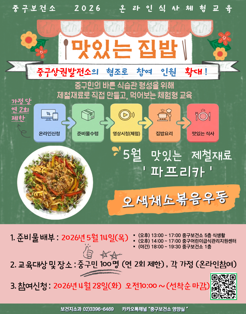중구보건소와 함께하는 🥗🍴 2026년 5월 온라인식사체험교육 🤍 참여 대상자 모집 안내 ◾교육방법 준비물 수령 후 각 가정에서 교육영상을 보며 직접 만든 후 식사를 하는 교육입니다! ※ 교육영상은 대상자 분들께 교육당일 문자로 발송 ※ 준비물 일부 별도 제공 < 메 뉴 > 오색채소볶음우동 ◾준비물 배부 2026. 5. 14.(목) ✅ (오후) 13:00~17:00 중구보건소 ...