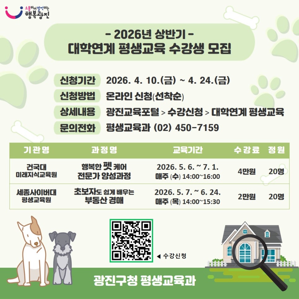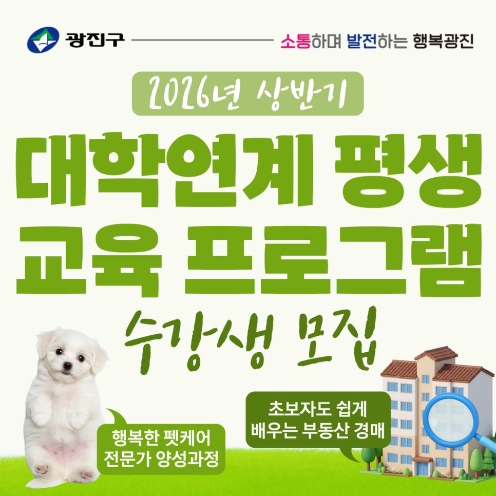 배움의 즐거움을 찾는 광진구민 여러분! 대학의 우수한 인프라를 활용해 깊이 있는 강의를 들을 수 있는 '2026 대학연계 평생교육' 프로그램이 수강생 모집을 시작합니다! 📢 우리 댕냥이를 위한 '행복한 펫 케어 전문가 과정'과 재테크의 기초를 다지는 '부동산 경매' 강의까지, 건국대와 세종사이버대 교수진의 훌륭한 강의를 광진구민 혜택으로 만나보실 수 있습니다! 🤩📋...