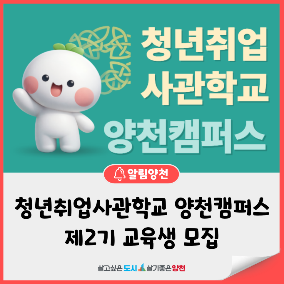 Previous image Next image 이미지를 누르면 사진이 커져요! 청년취업사관학교 양천캠퍼스에서 현장 중심의 디지털 신기술 실무역량 교육을 제공하고, 취창업 연계 지원 프로그램을 운영합니다. 청년 구직자분들의 많은 관심과 참여 바랍니다. 모집기간 2026. 4. 1(수) ~ 4. 30.(목) 모집대상 만 15세 이상 서울시민 또는 서울시 거소 미취업자 모집인원 50명 (...)